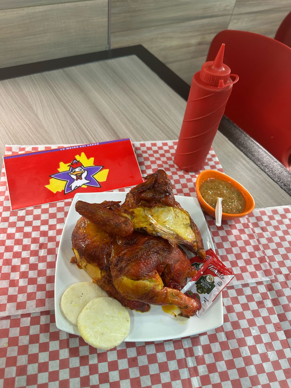 Medio pollo asado, 1/4 gratis de pollo asado y arepa.