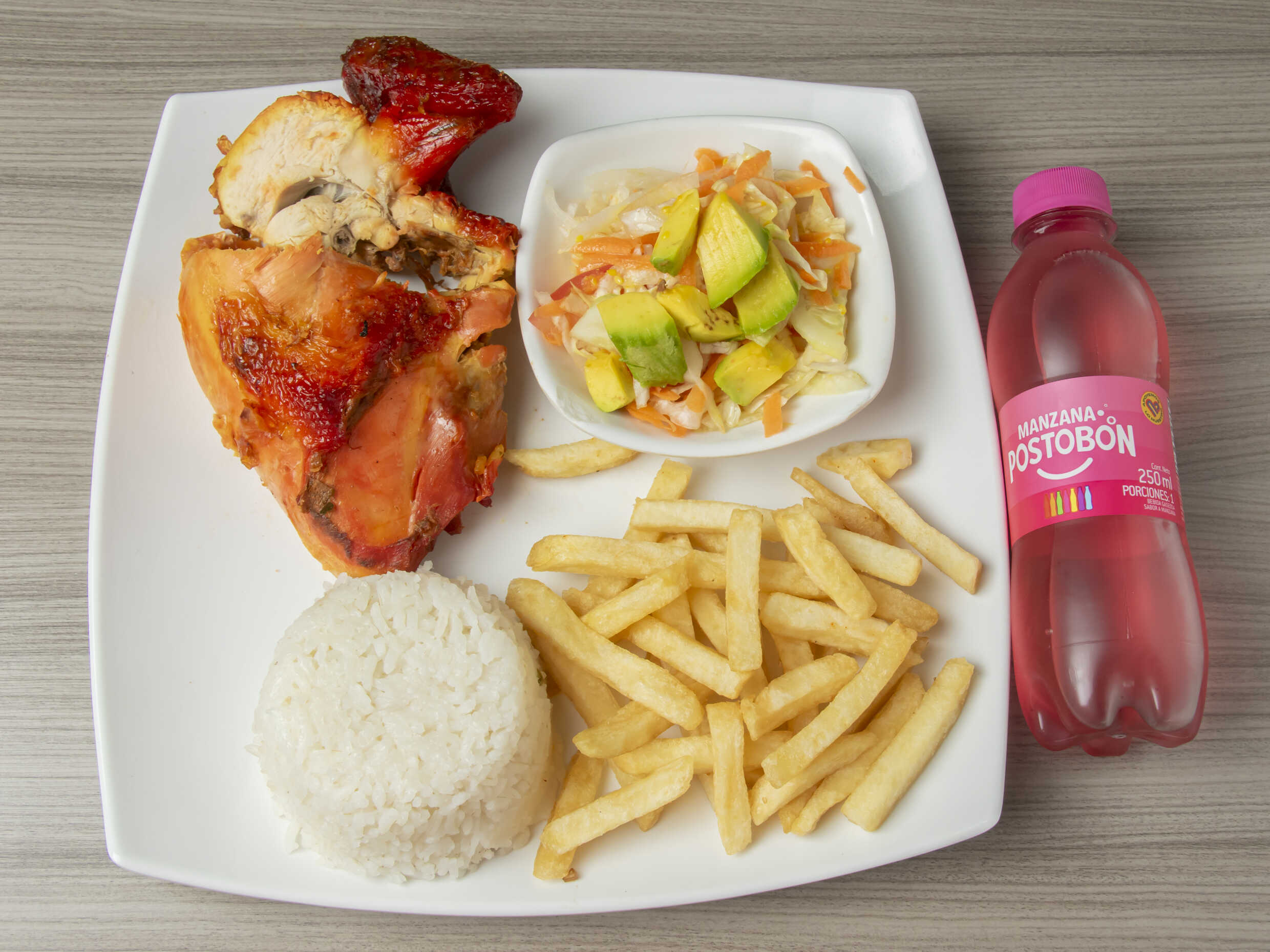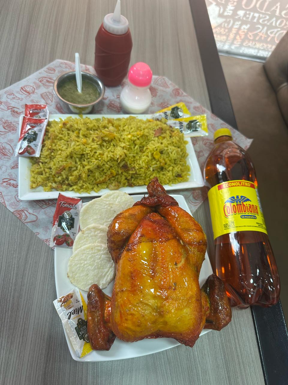 Medio Pollo Asado*1 + Porción de Arroz*1 + Gaseosa Colombiana Postobón 250 ML*1