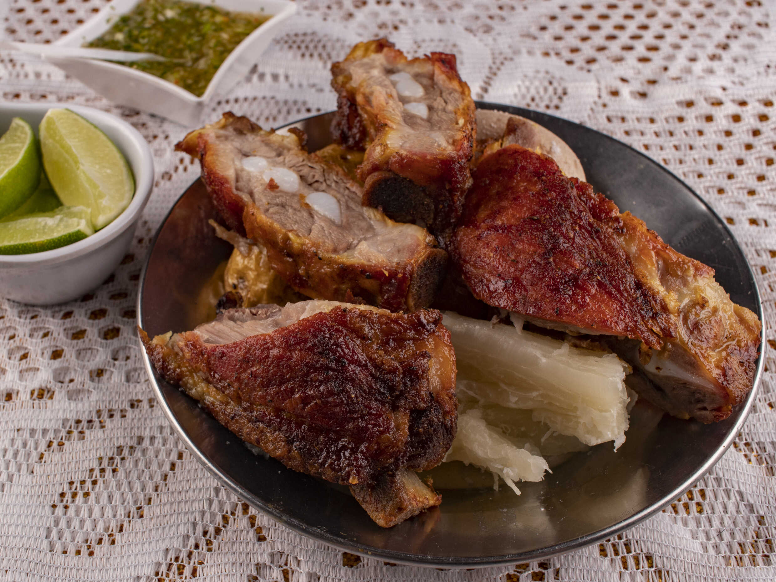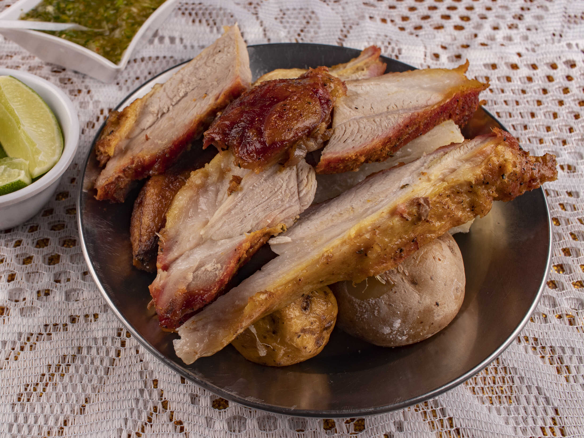 1/4 de gallina, 1/2 porción de carne o costilla de cerdo, papa, yuca y plátano.