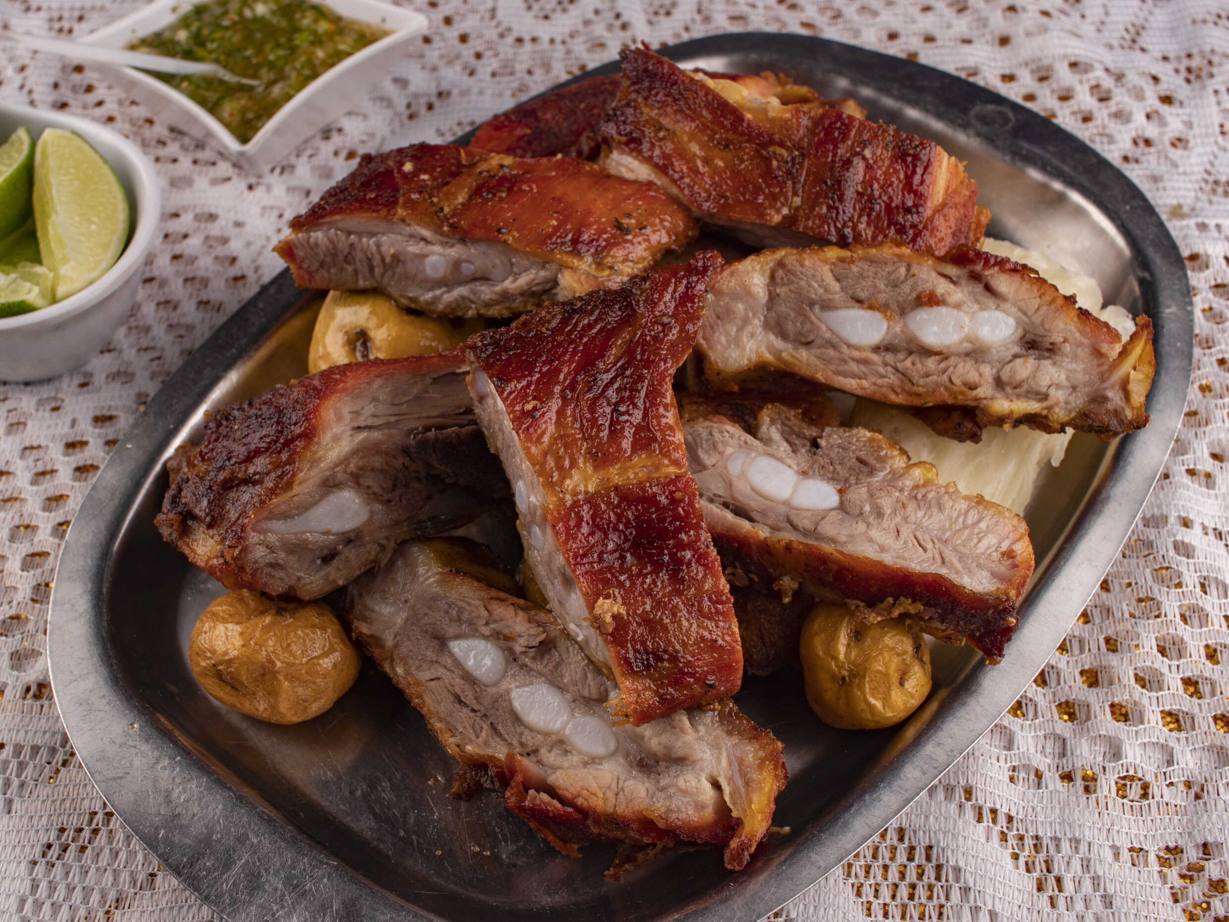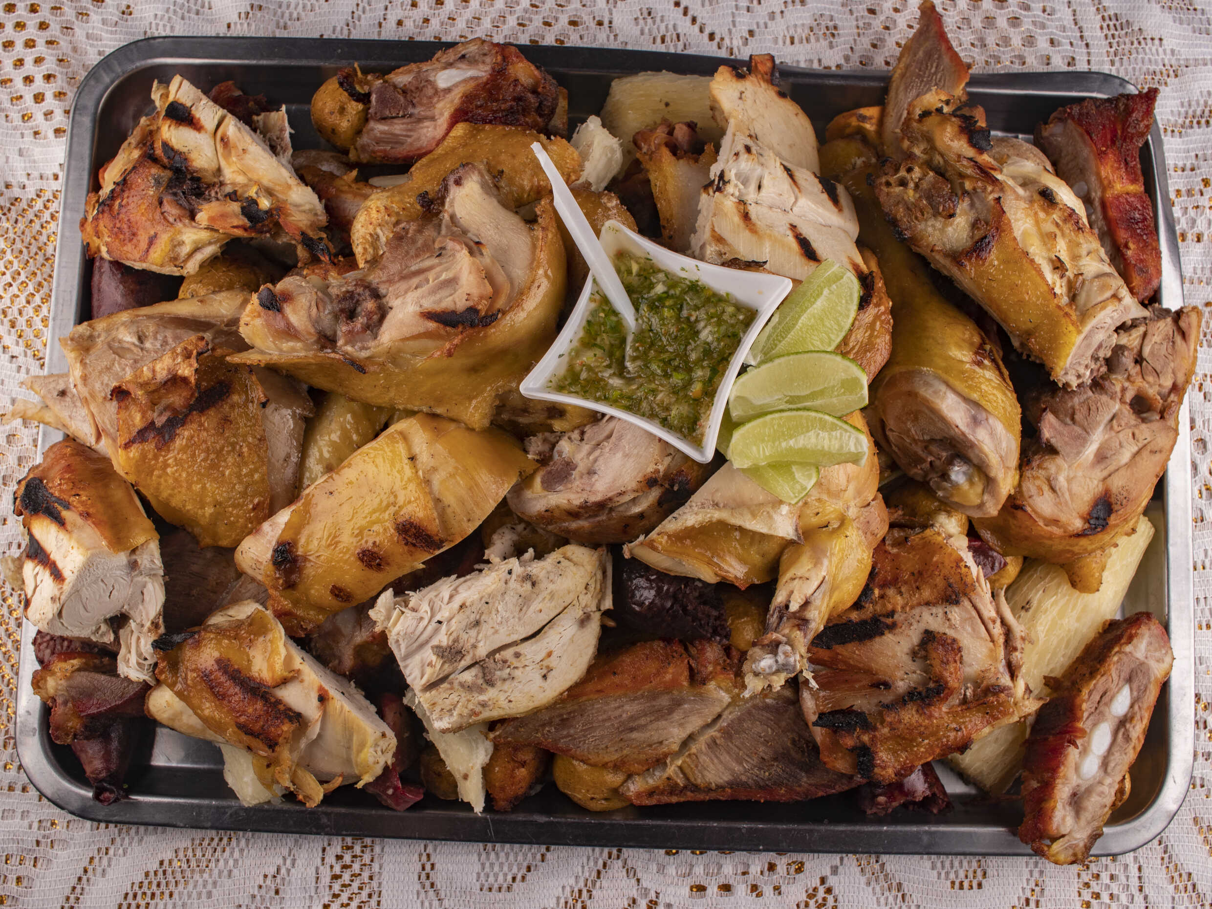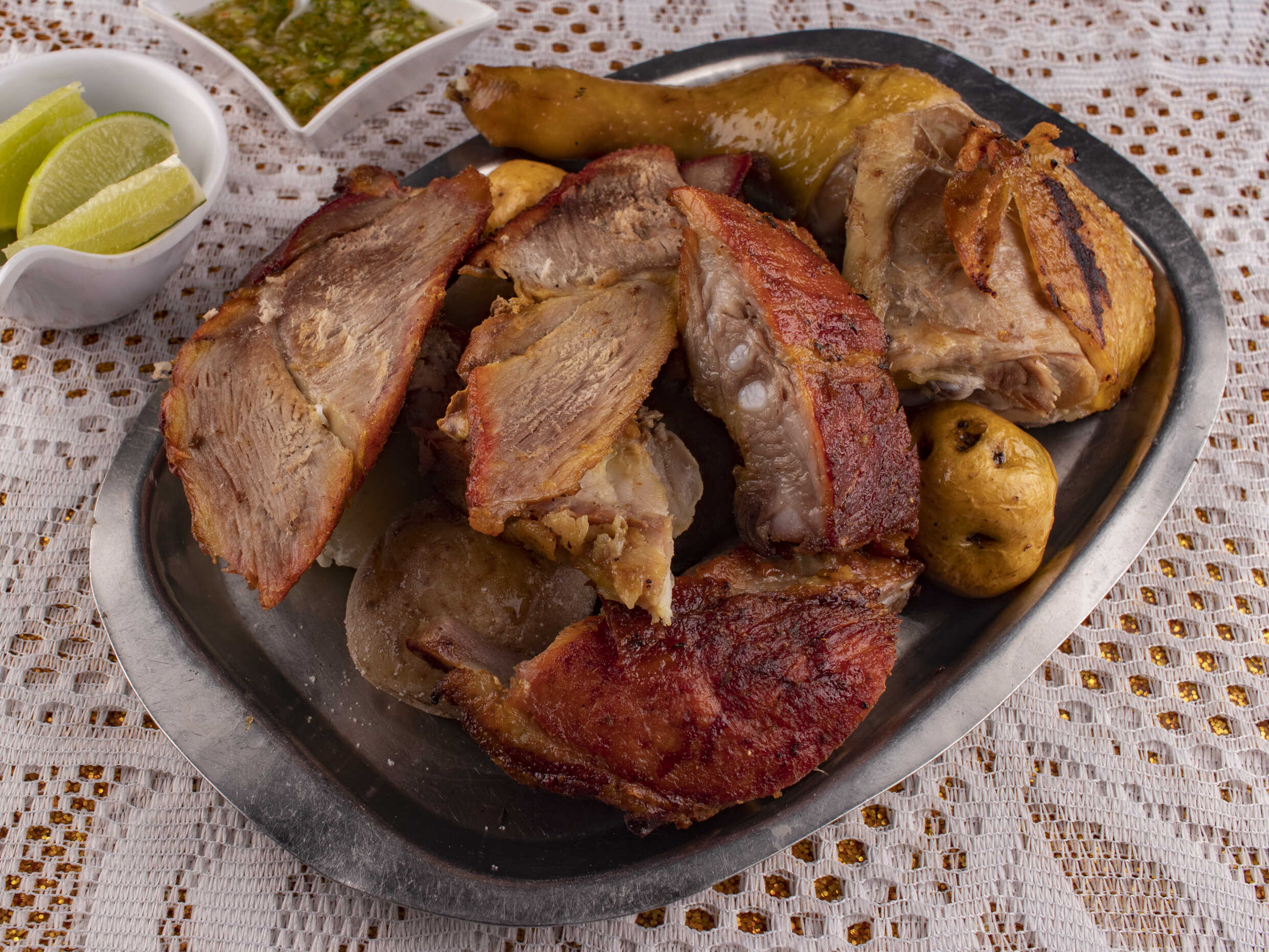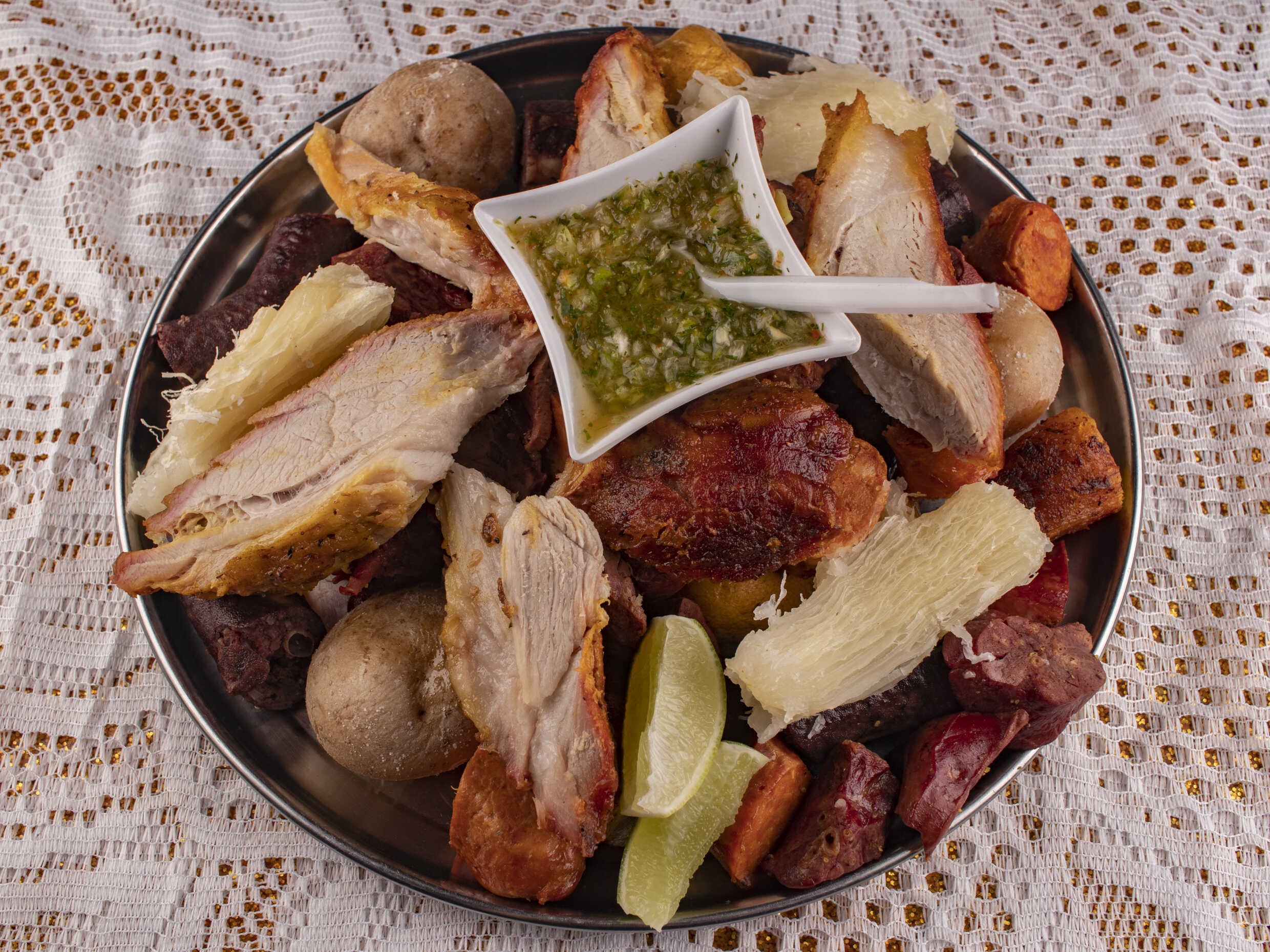 2 presas de gallina, carne de chigüiro o costilla de cerdo, rellena, longaniza, asadura, papa criolla, yuca y plátano.