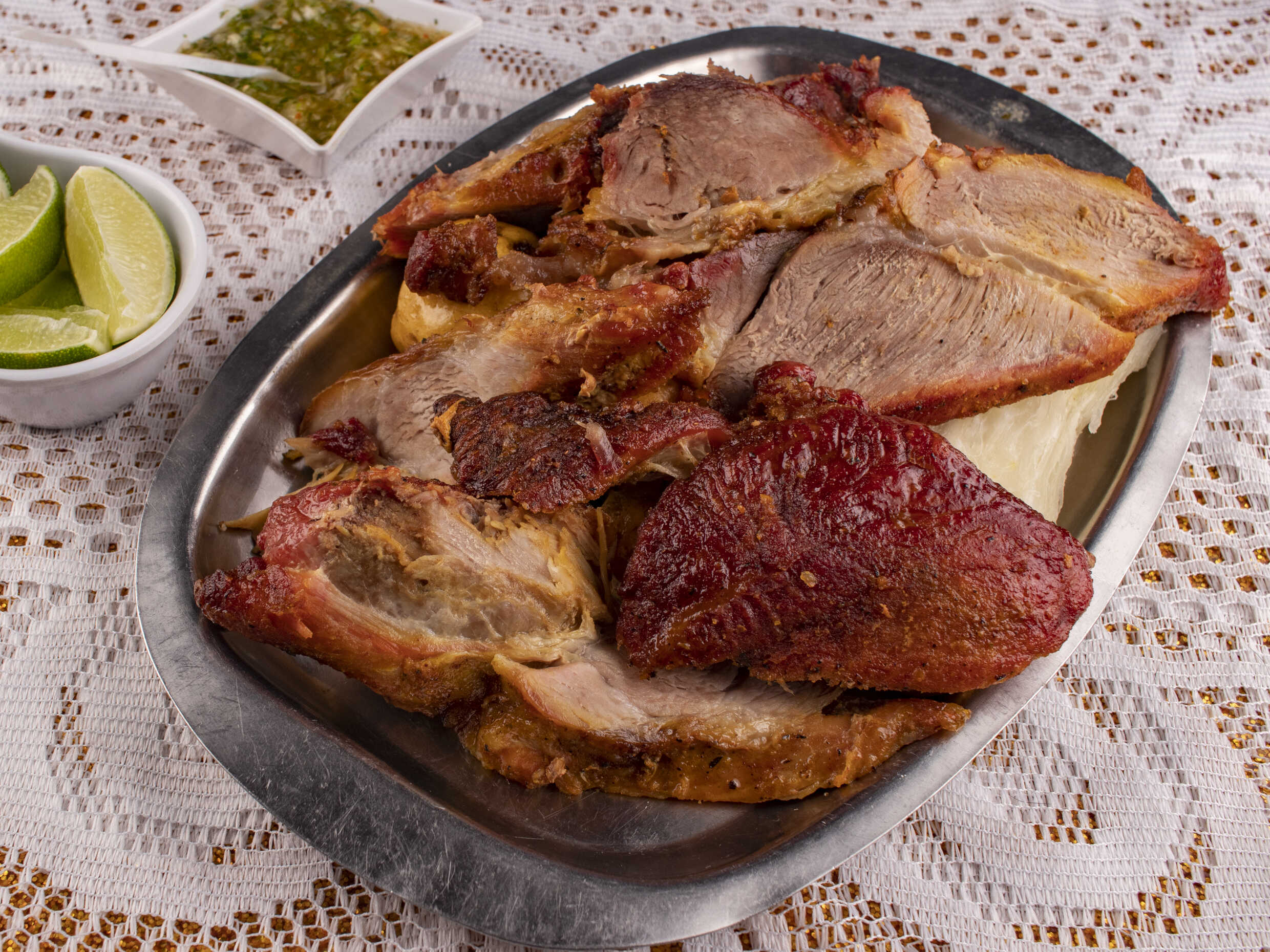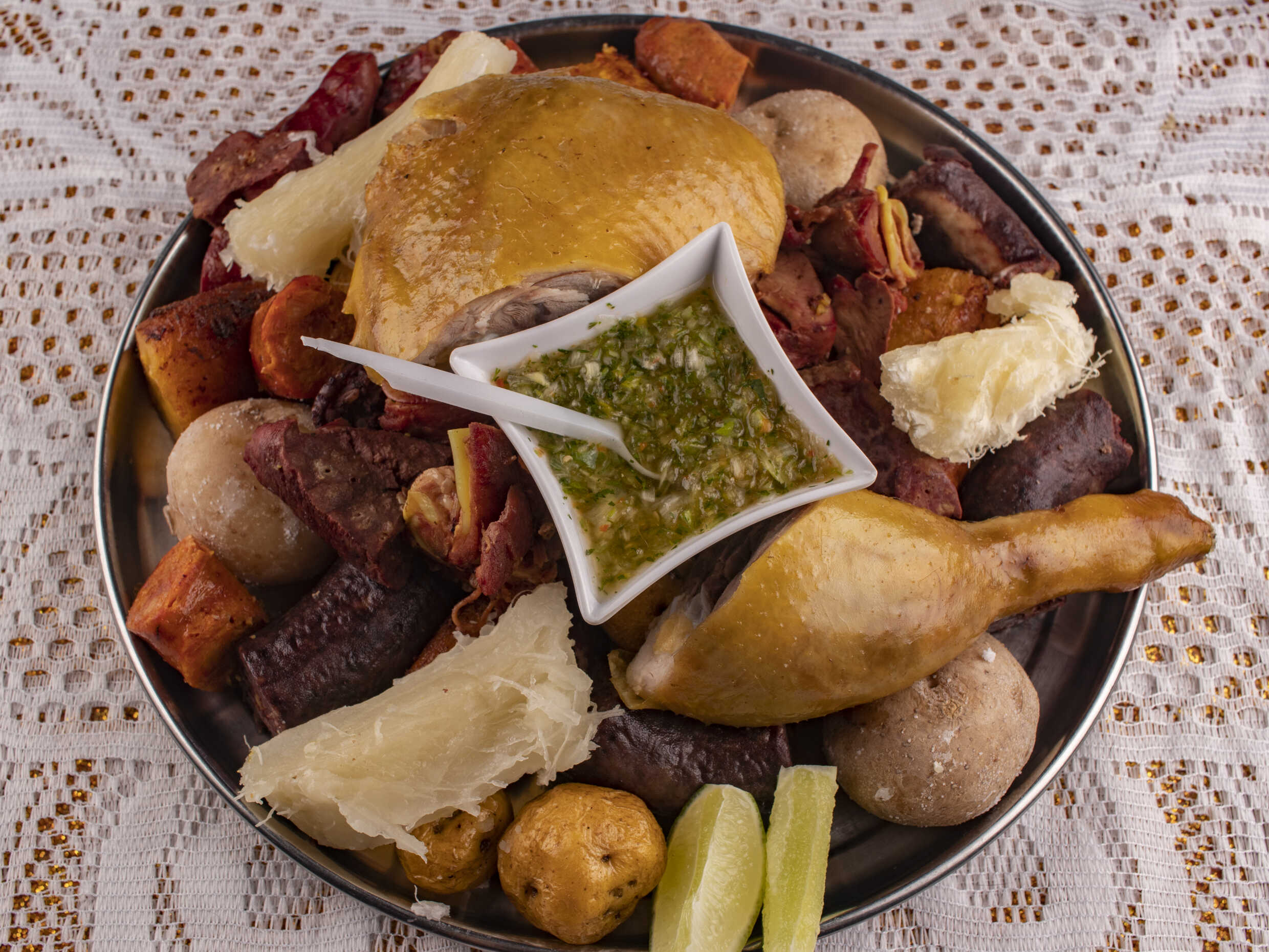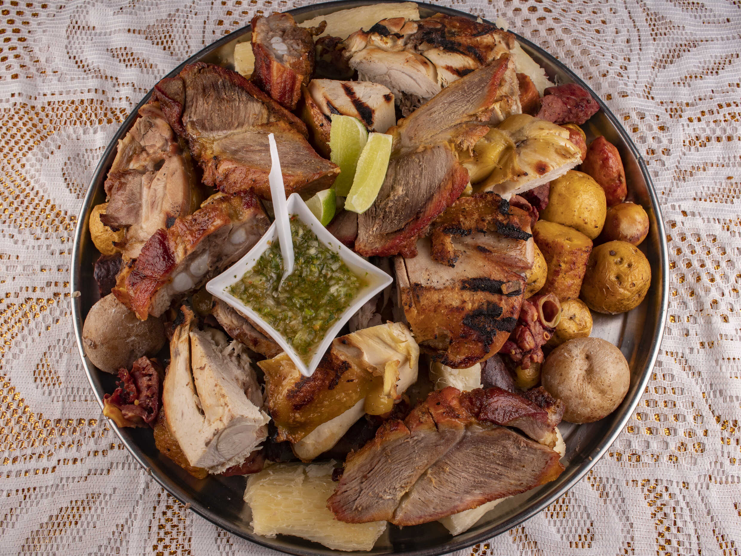 Para 4 personas, con carne chigüiro ó costilla de cerdo, presa de gallina, rellena, longaniza, asadura, papa criolla, yuca, plátano, ají