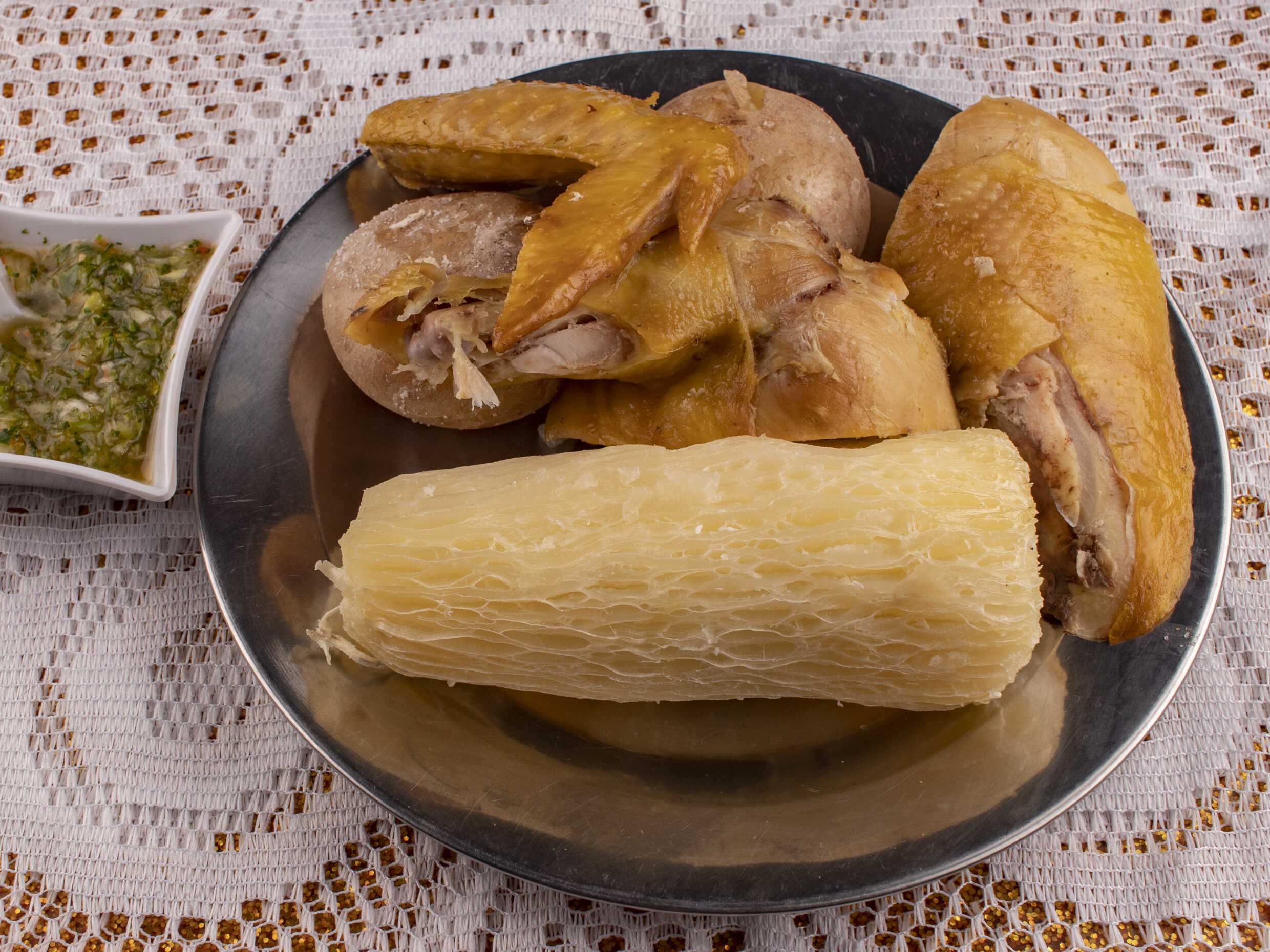 pechuga de gallina, Con papa y yuca.