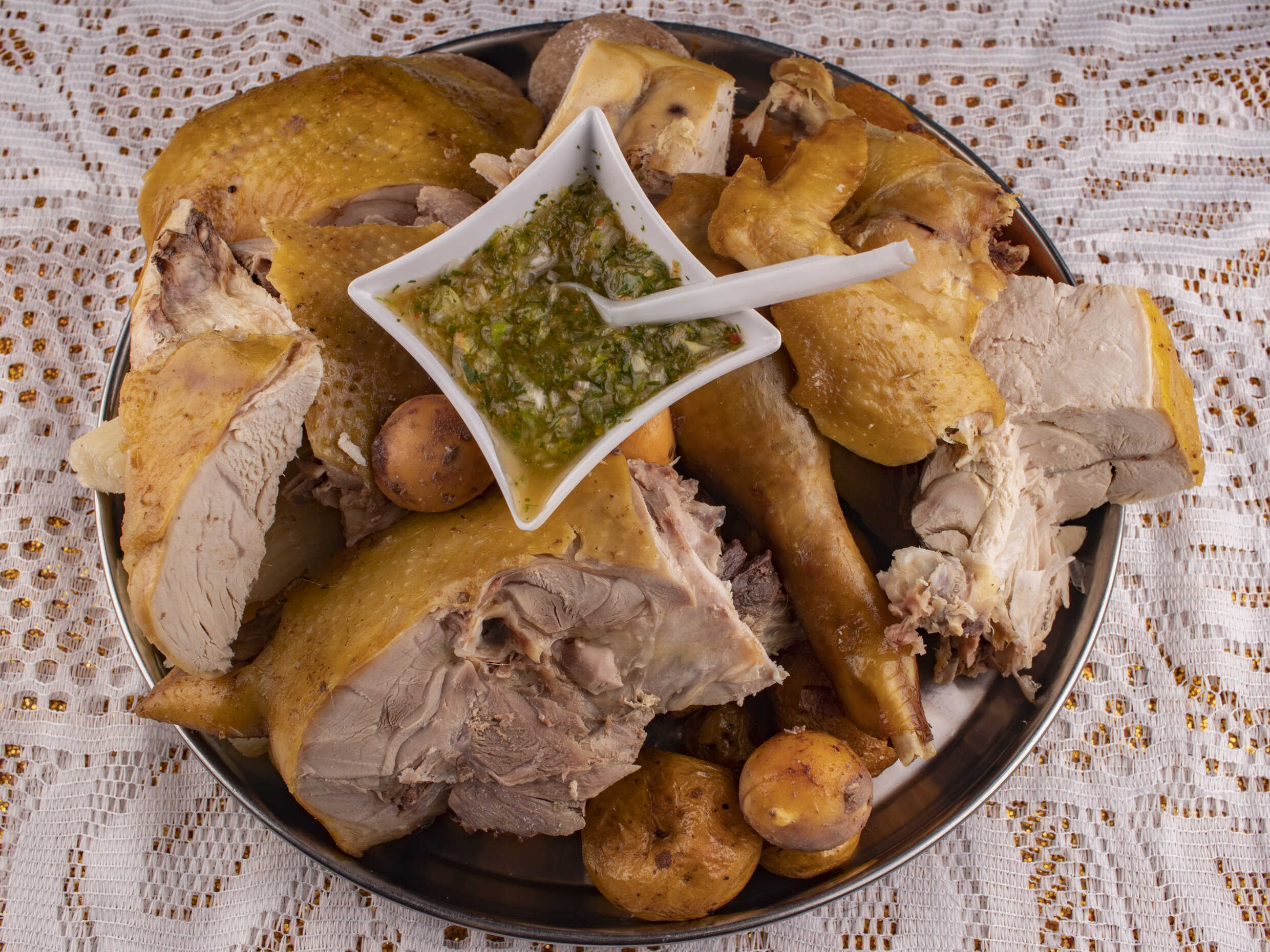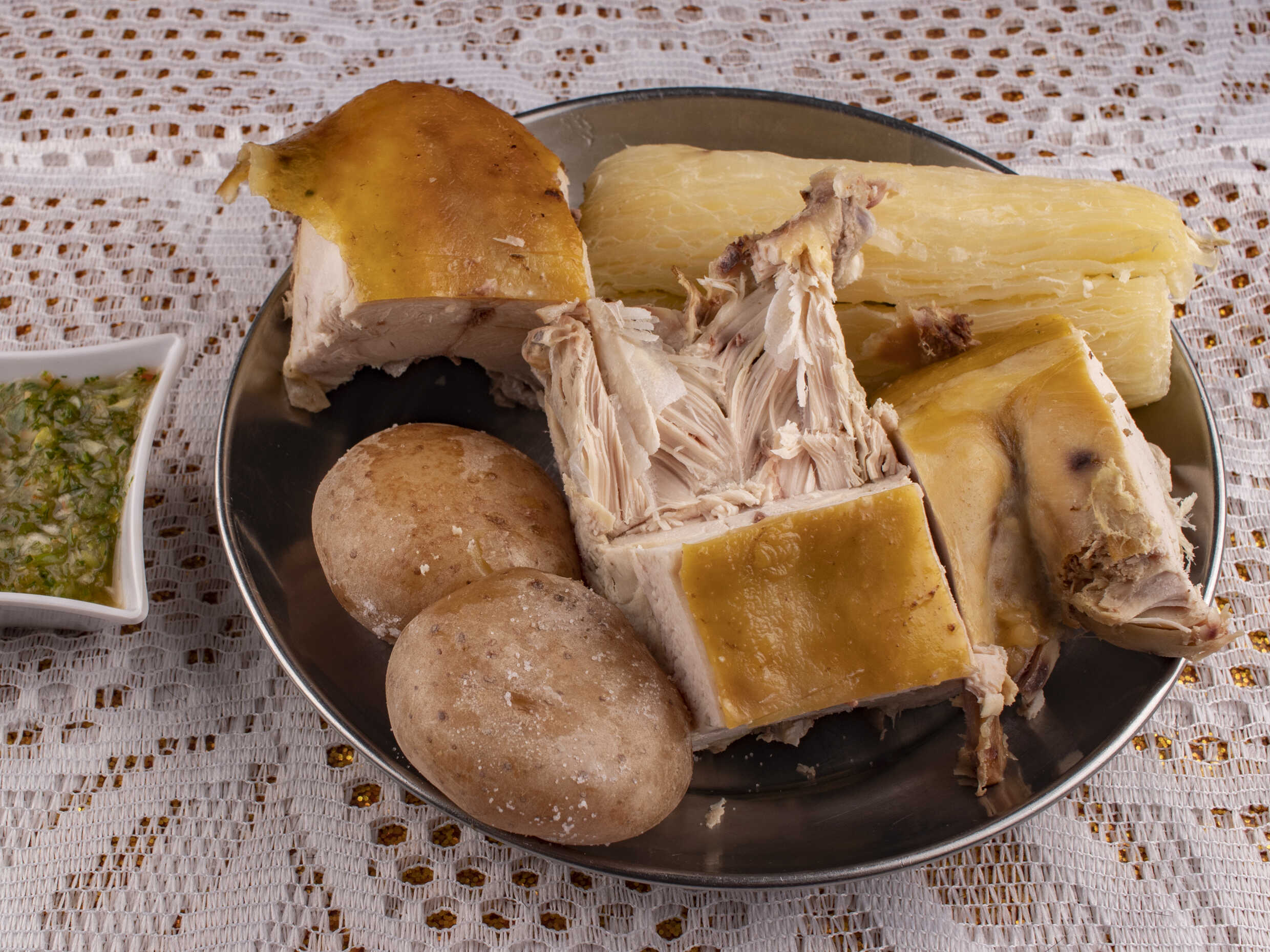 pierna pernil de gallina, Con papa y yuca.