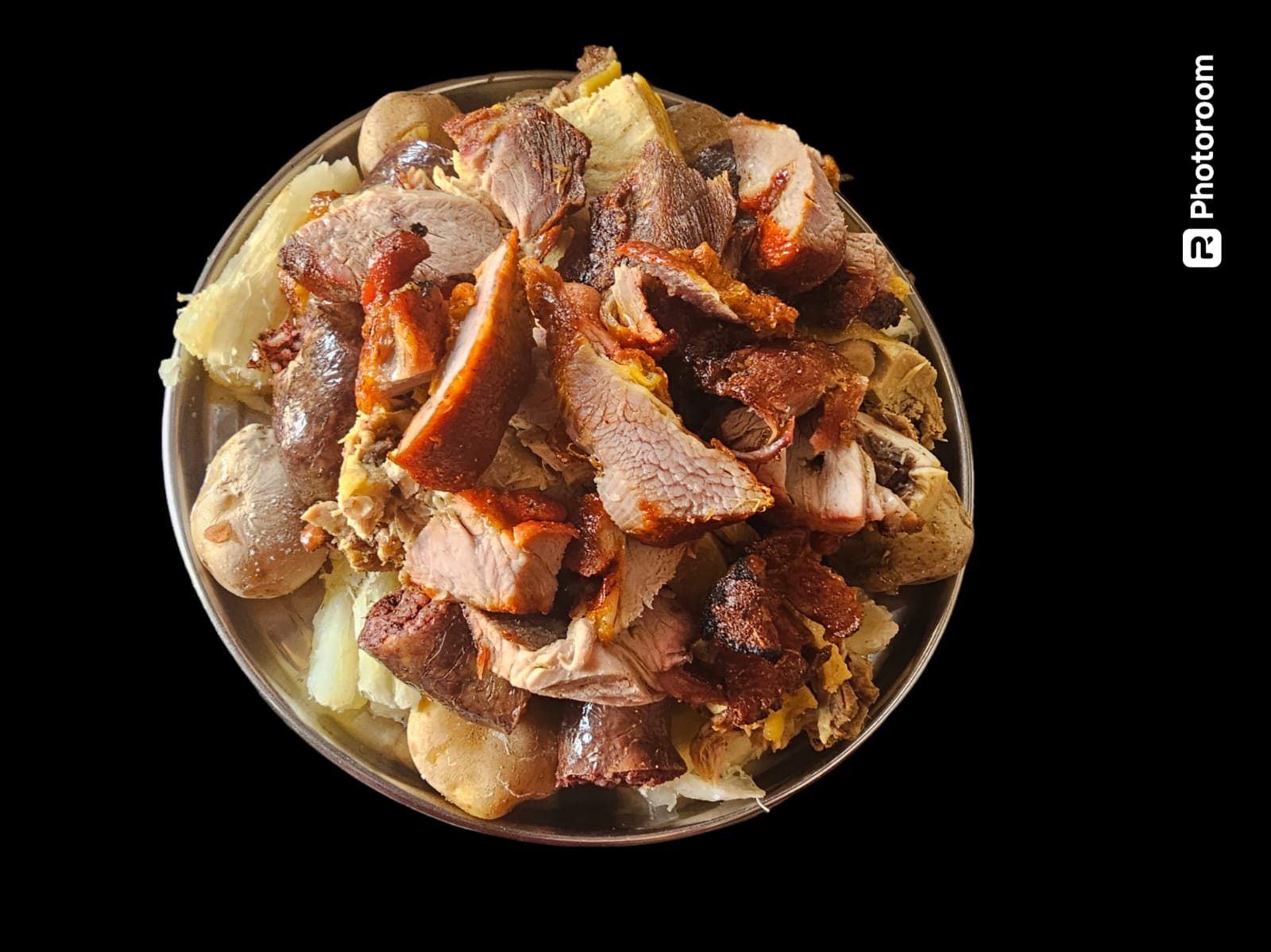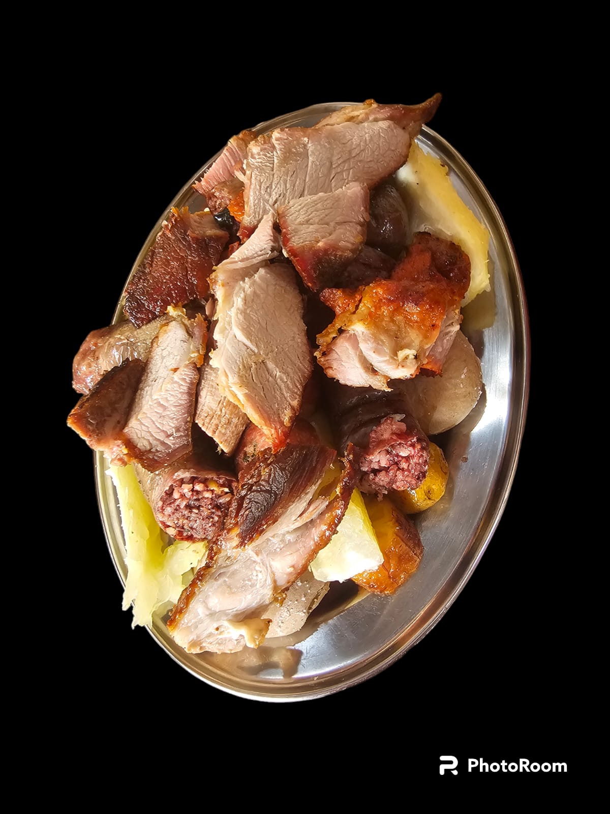 Picada dúo, recomendada para 2 personas, Carne de res o de de cerdo (300 gramos aprox), rellena , longaniza, papa criolla, papa salada , yuca y plátano