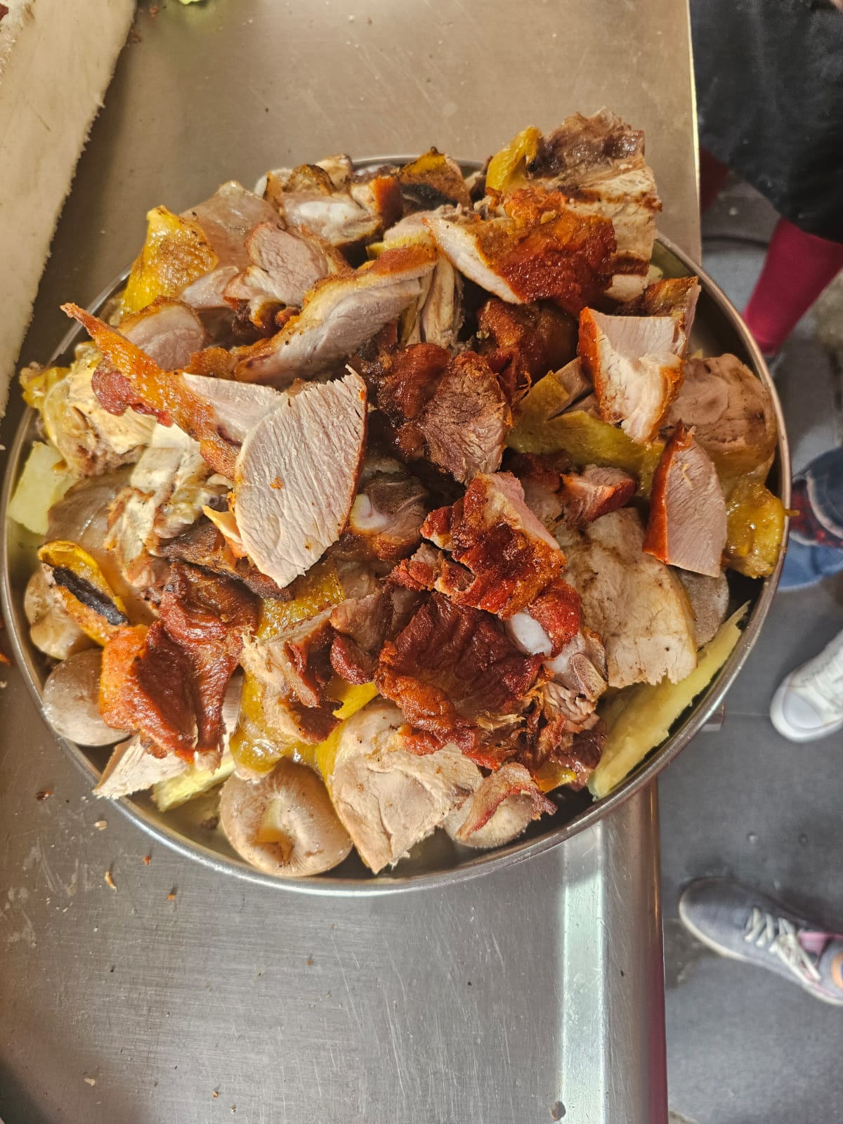 Mega familiar, recomendada para 8 personas, Gallina entera, carne mixta o a elección (550 gramos aprox), rellena, longaniza, papa - criolla, salada, yuca y plátano
