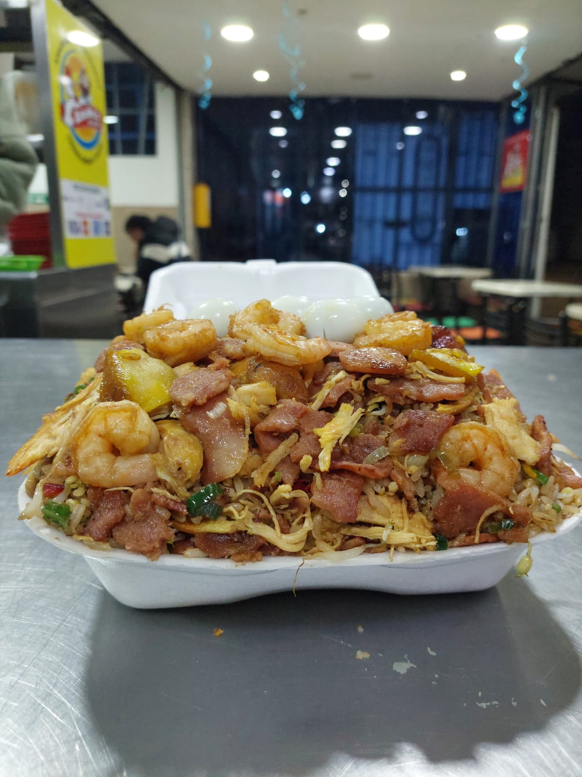 camaron + tocineta + pollo + cerdo + res +jamón + huevos de codorniz + francesa+ 1 lumpia .