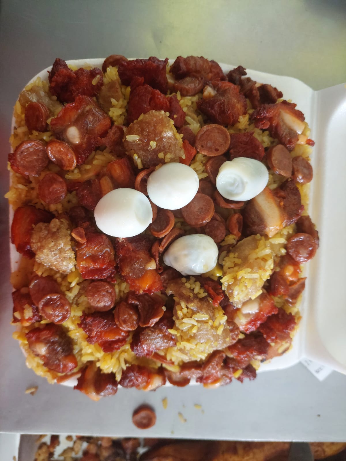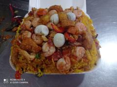 Arroz Paisa Personal ( 200 gramos) + camaron + pollo desmechado + tocineta +chorizo (200 gramos ) + salchicha tradicional + chicharron + carne de cerdo + maiz tierno + platano maduro + papa a la francesa + 1 huevos de codorniz+ salsa de tomate y agridulce
