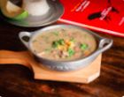 Platillo personal, aprox. 375 g de carne entre mamona, costilla de cerdo, chiwi y ternera, acompañado de 3 papas saladas, 2 maduros, 1 arepa boyacense, guacamole y ají.