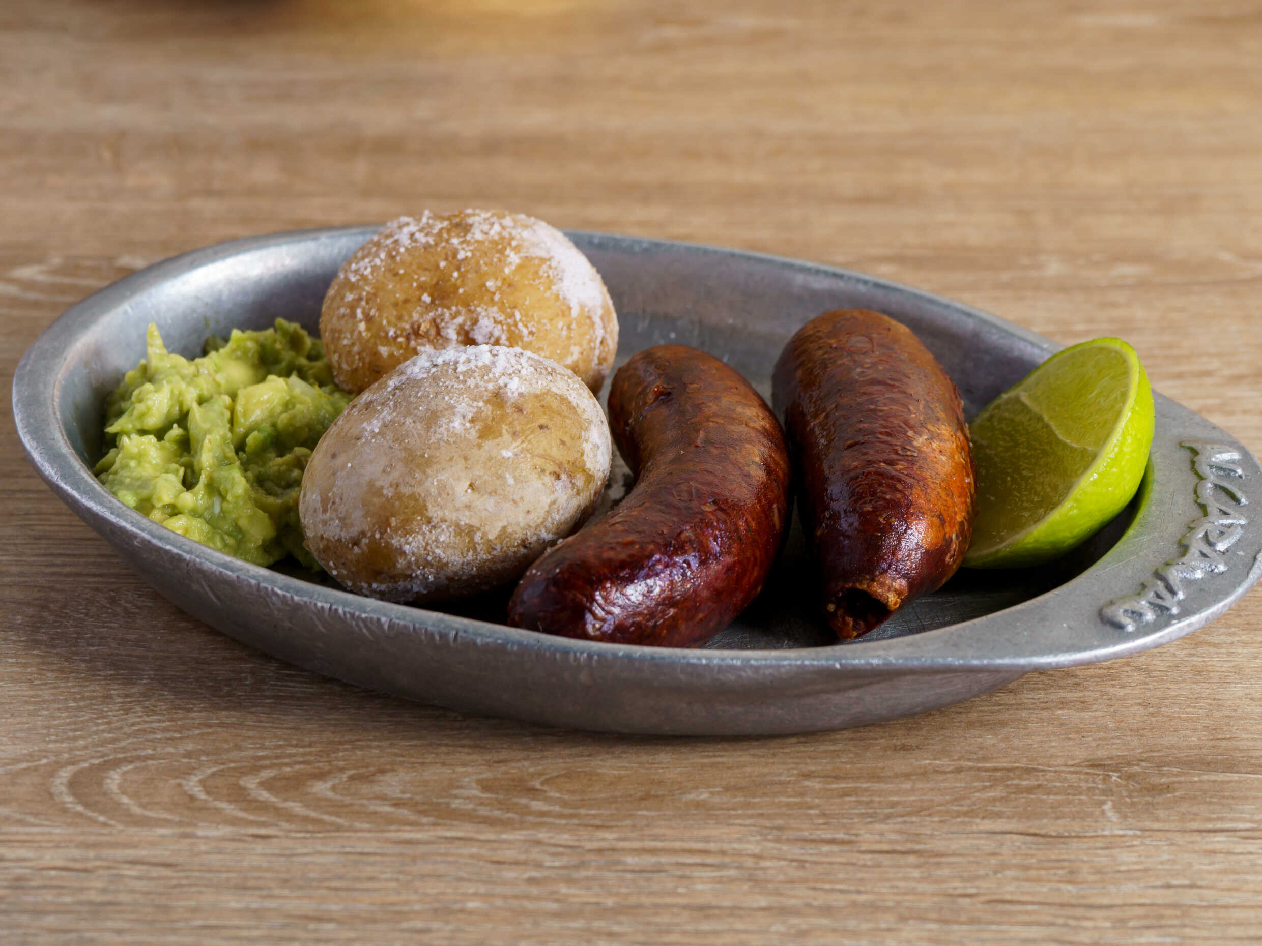 260gr de chigüiro, 40gr de ternera, 2 rellenas, 2 chorizos, papitas criollas, 2 maduros, 2 arepas, guacamole, ají, más dos limonadas.