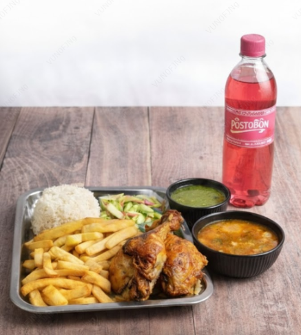 1/4 pollo broaster papa francesa, arepa, salsa.