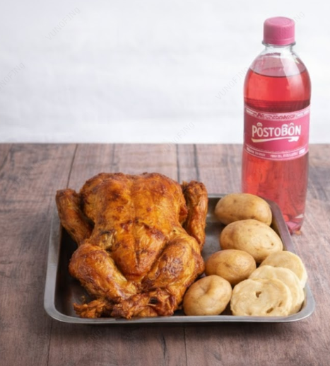 1 pollo asado incluye papa salada, arepa y ají (Para max 4 personas)