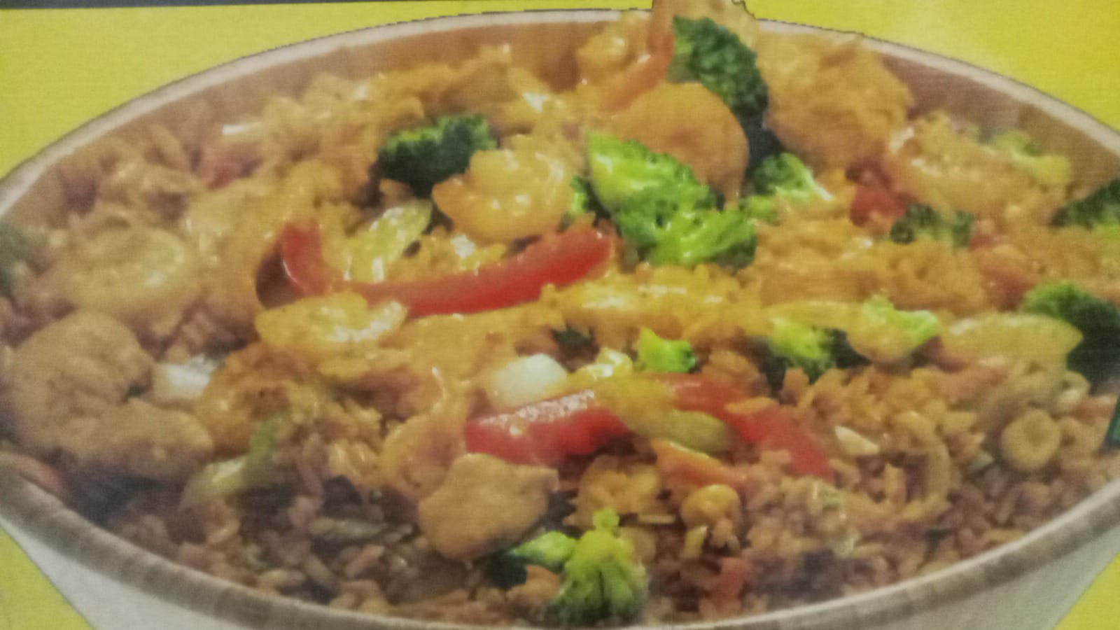 Arroz chino (incluye arroz salteado con una mezcla de pollo, cerdo, camarones, huevo revuelto, cebolla, pimentón y zanahoria. Se sazona con salsa de soja y aceite de sésamo). A la valenciana (1/2 pollo + churrasco) papa francesa para dos personas.