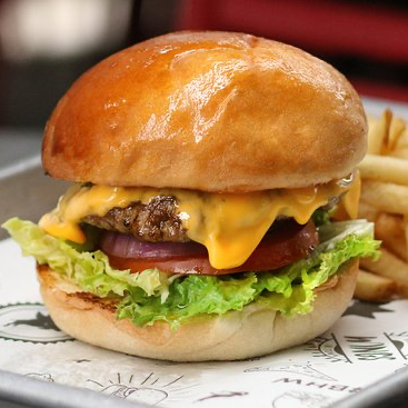 Doble carne 100% de res de 180 g envuelta en tocineta, queso cheddar, pan brioch con salsa a base de tocineta y vegetales.