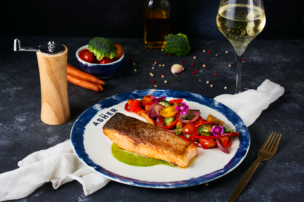 Filete de salmón sellado con emulsión de cilantro y jardín de vegetales salteados.