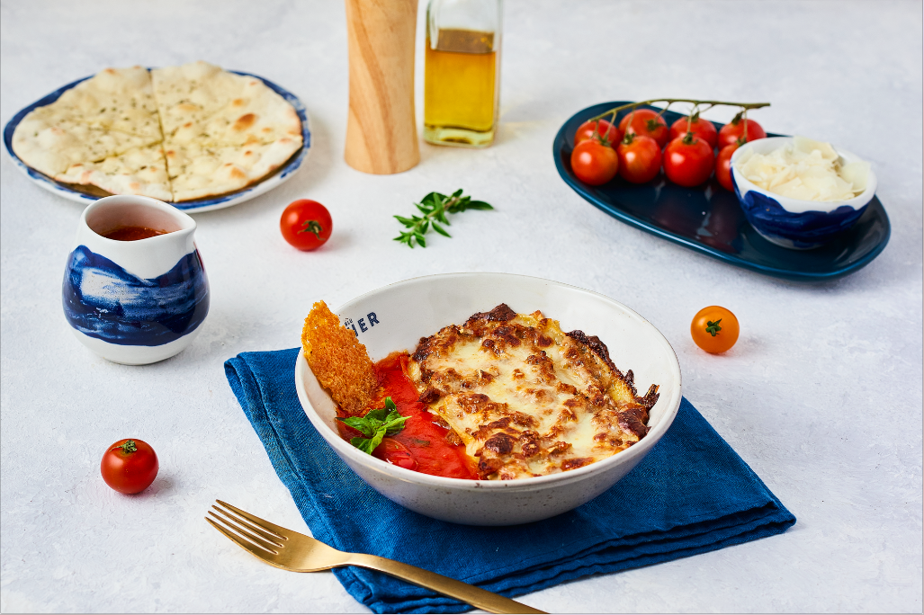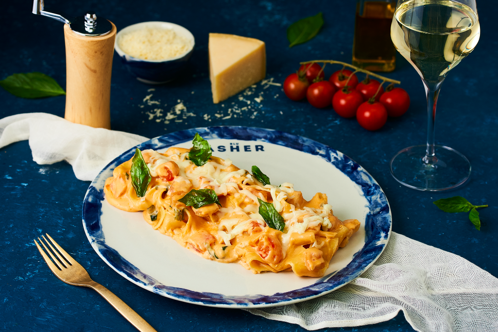 Tradicional pasta larga ancha con salsa napolitana, crema, cubos de tomate, albahaca, mozzarella fundido y parmesano reggiano.