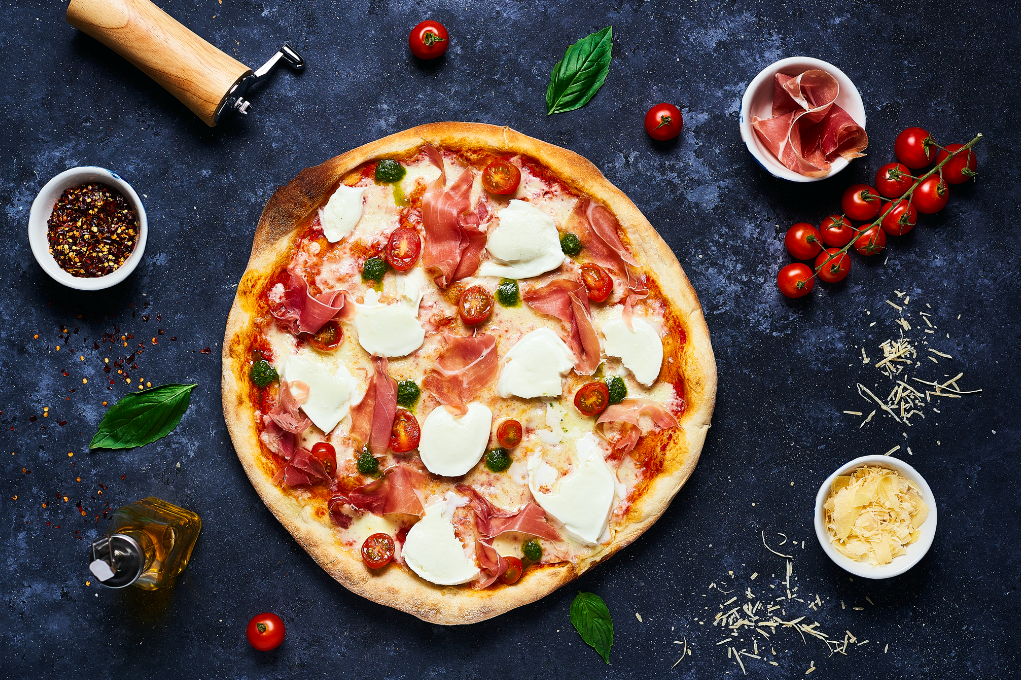 Durazno caramelizado acompañado de queso mozzarella, salsa napolitana y prosciutto crocante.