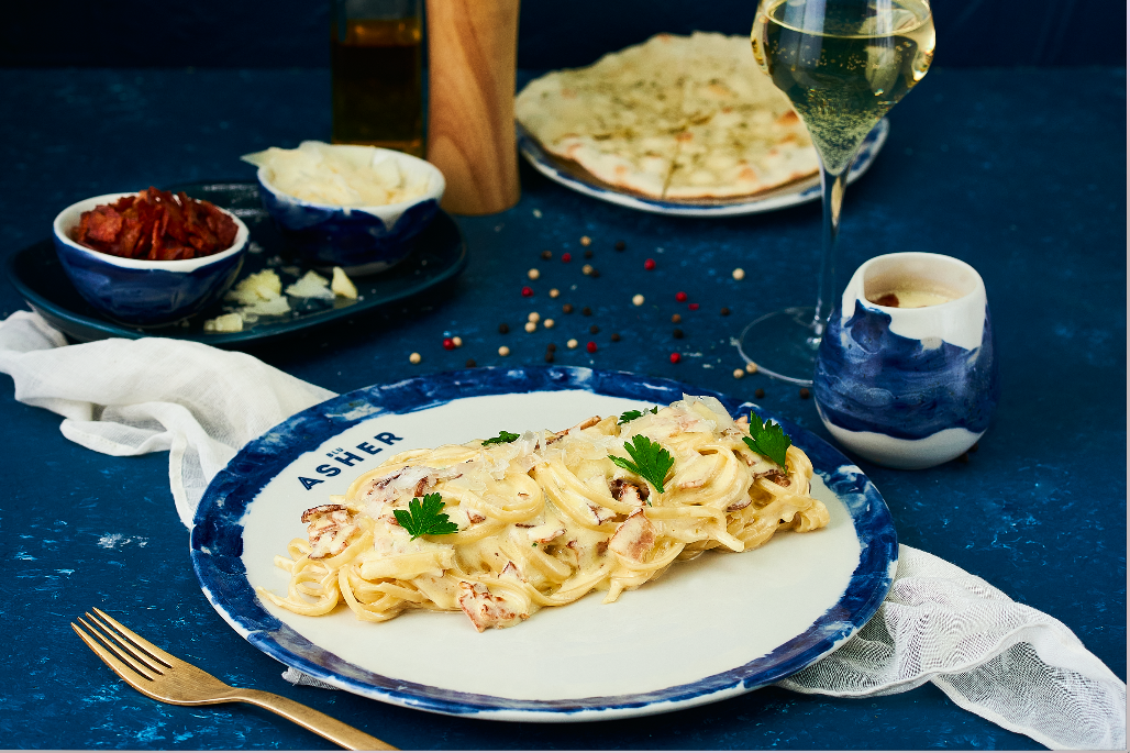 Tocineta ahumada servida con pasta, crema y parmesano reggiano.