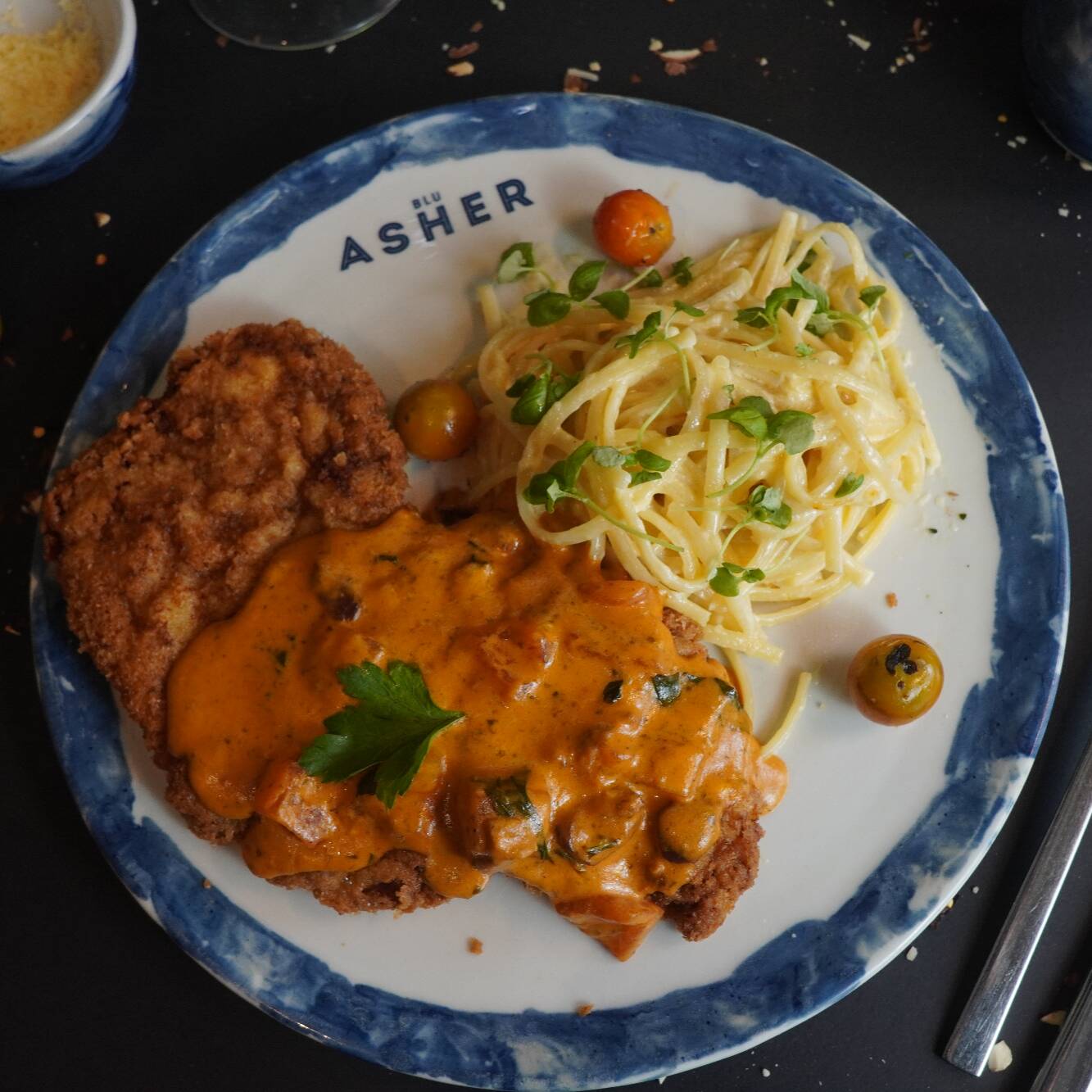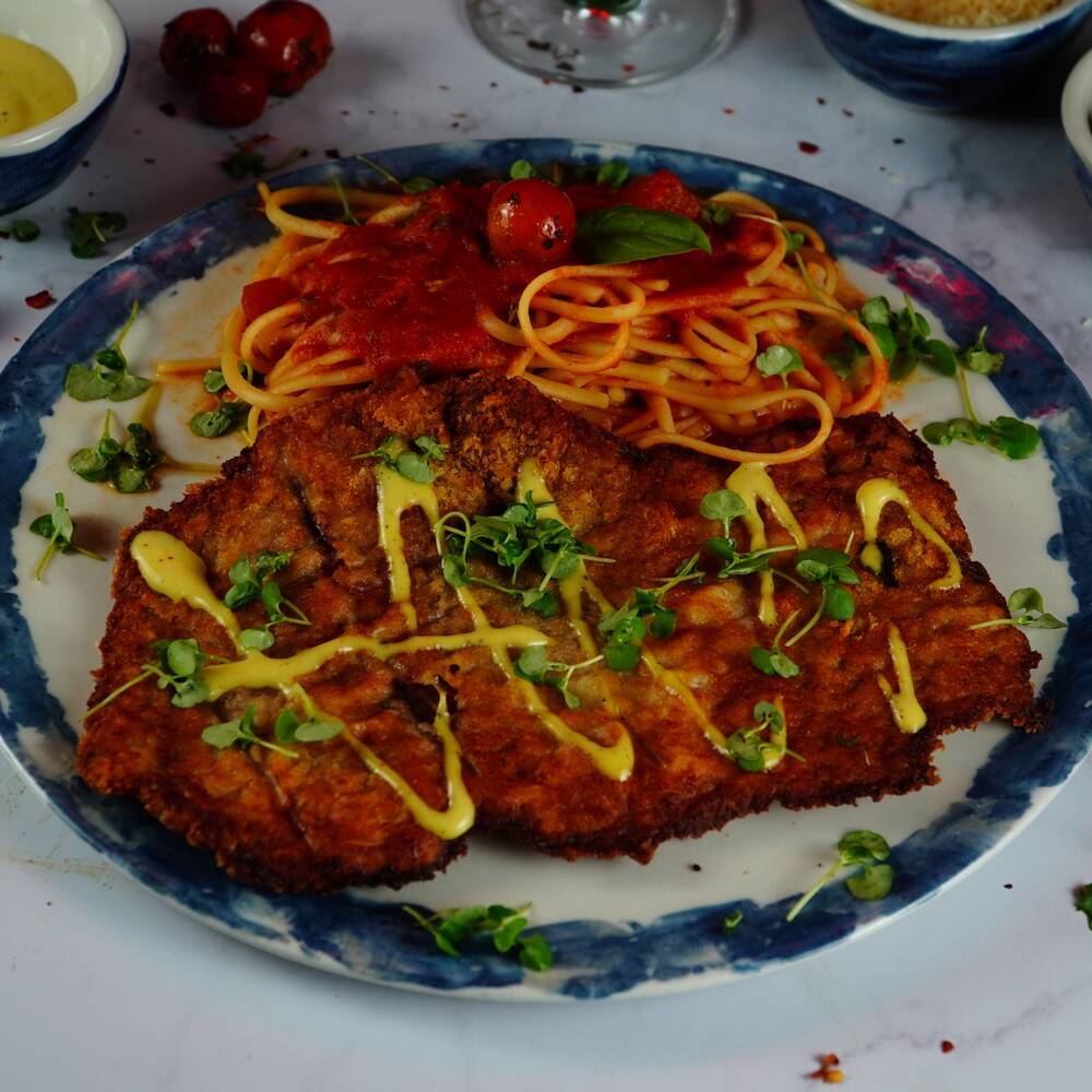 Milanesa de cerdo crocante, terminada con salsa de la casa a base de naranja y mostaza. Acompañada con linguine pomodoro.