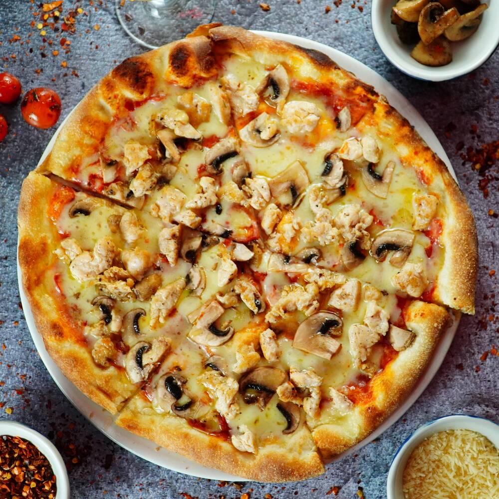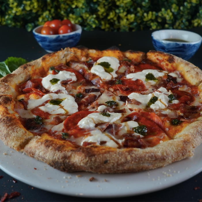 Mezcla balanceada de pepperoni, tocineta, queso straccitella de Bufala, pesto y reducción balsámica.