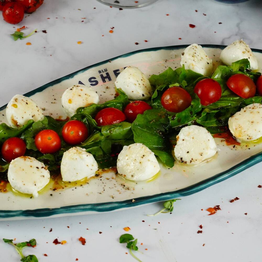 Rúgula fresca sobre una cama de pesto, acompañada de queso cilliguine de búfala, tomate cherry y terminada con reducción balsámica.