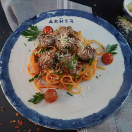 Bolas de ragú italiano sobre linguine con salsa boloñesa.