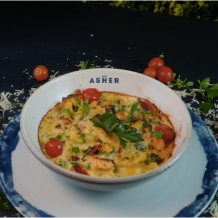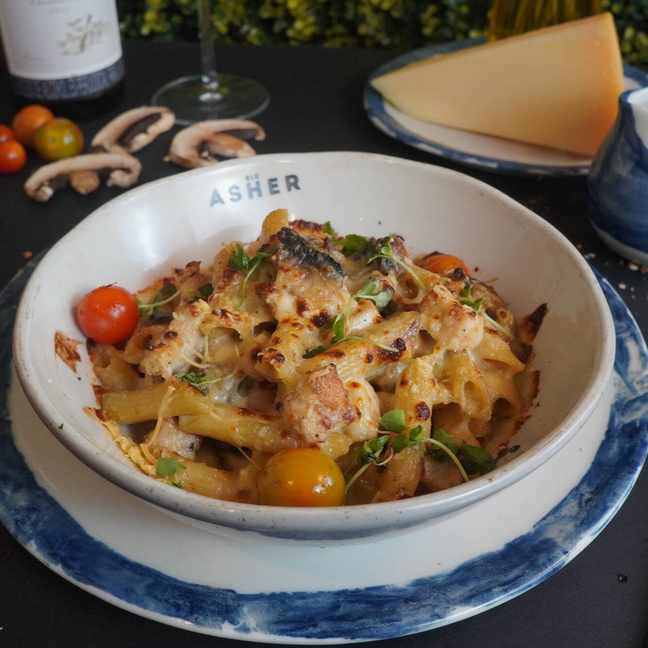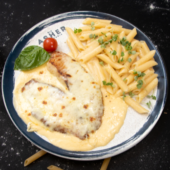 Penne gratinado al horno, acompañado de pollo y champiñones, mezclado con una salsa a base de crema, vino blanco y parmesano.