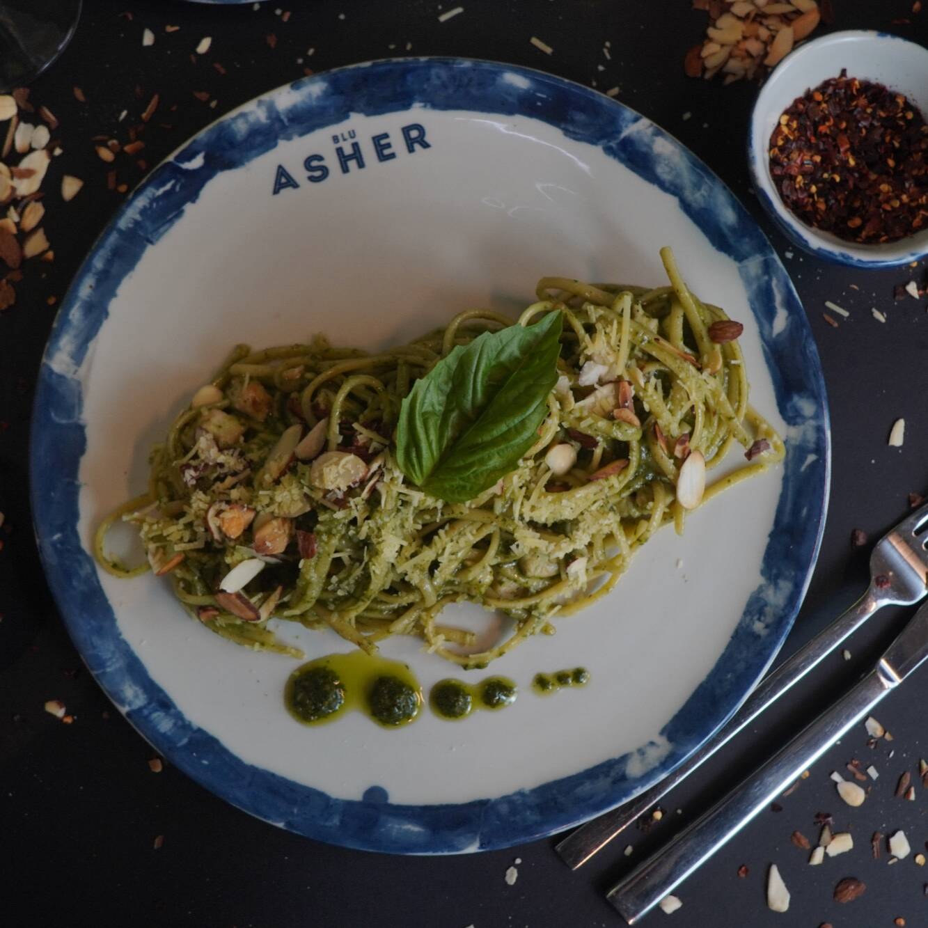 Linguine de Búfala, almendras y champiñon mezclada con nuestro pesto de la casa.