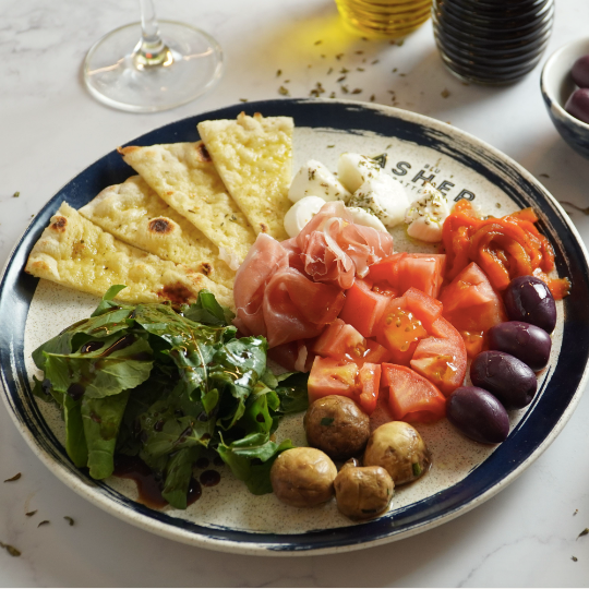 Prosciutto de parma, cilliguine de Bufala, pimentón encurtido, champiñones, aceitunas, tomate cherry y rugulada, acompañado de vinagre balsámico y gricinis.