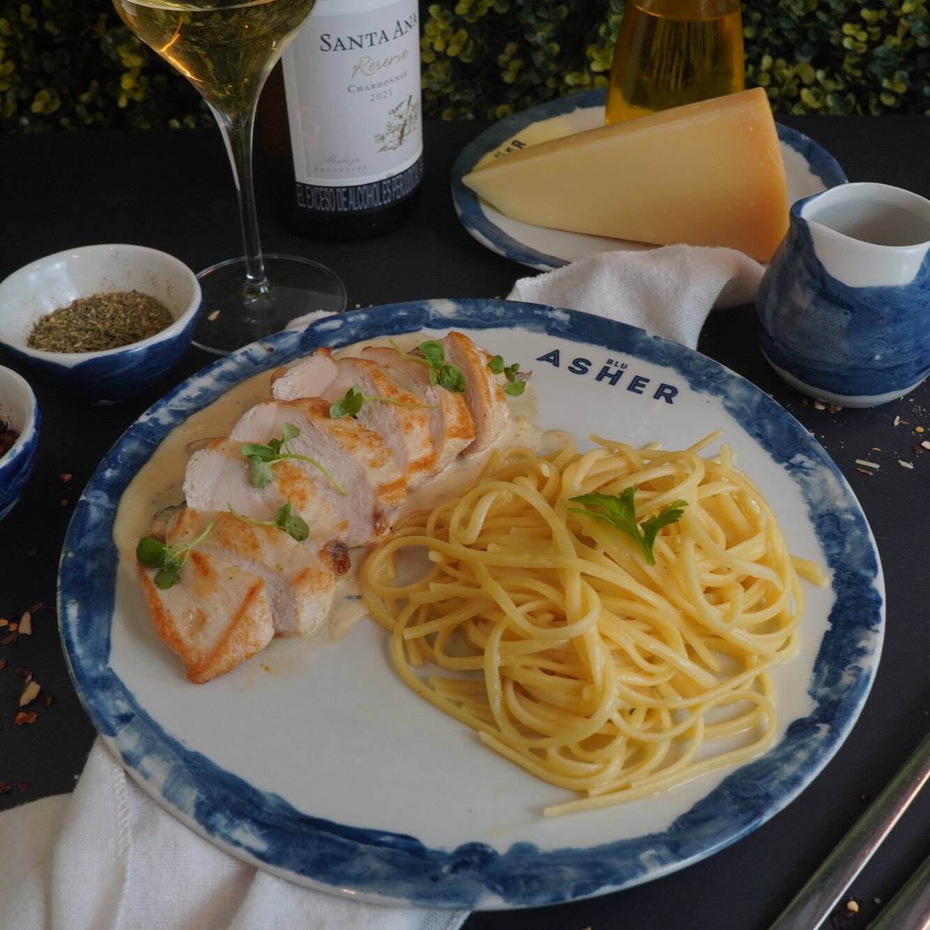 2X preparado con salvia, pollo braseado, crema, pasta y terminado con parmesano reggiano.