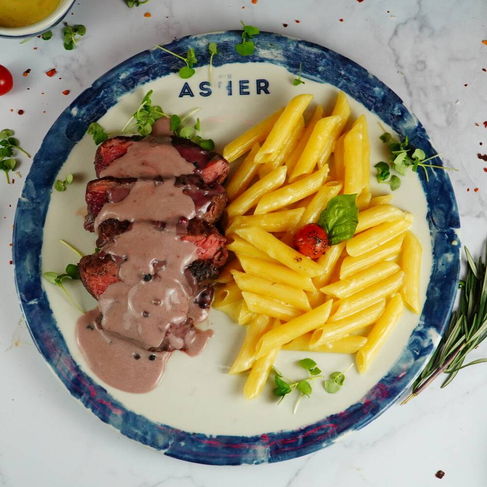 Medallón de lomo fino de res cubierto en nuestra salsa de tres pimientas y acompañado de penne en salsa Alfredo.