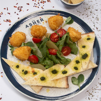 Queso Brie apanado en panko, acompañado de rúgula, pera caramelizada, tomate cherry y trozos de crostoni.
