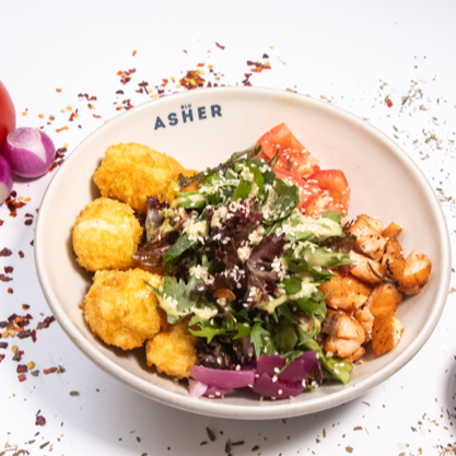 Queso Brie apanado, mix de lechugas, tomate, zanahoria y cebolla chalote curada