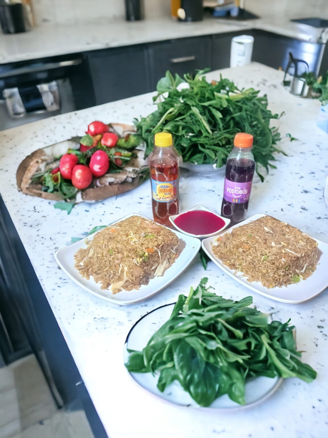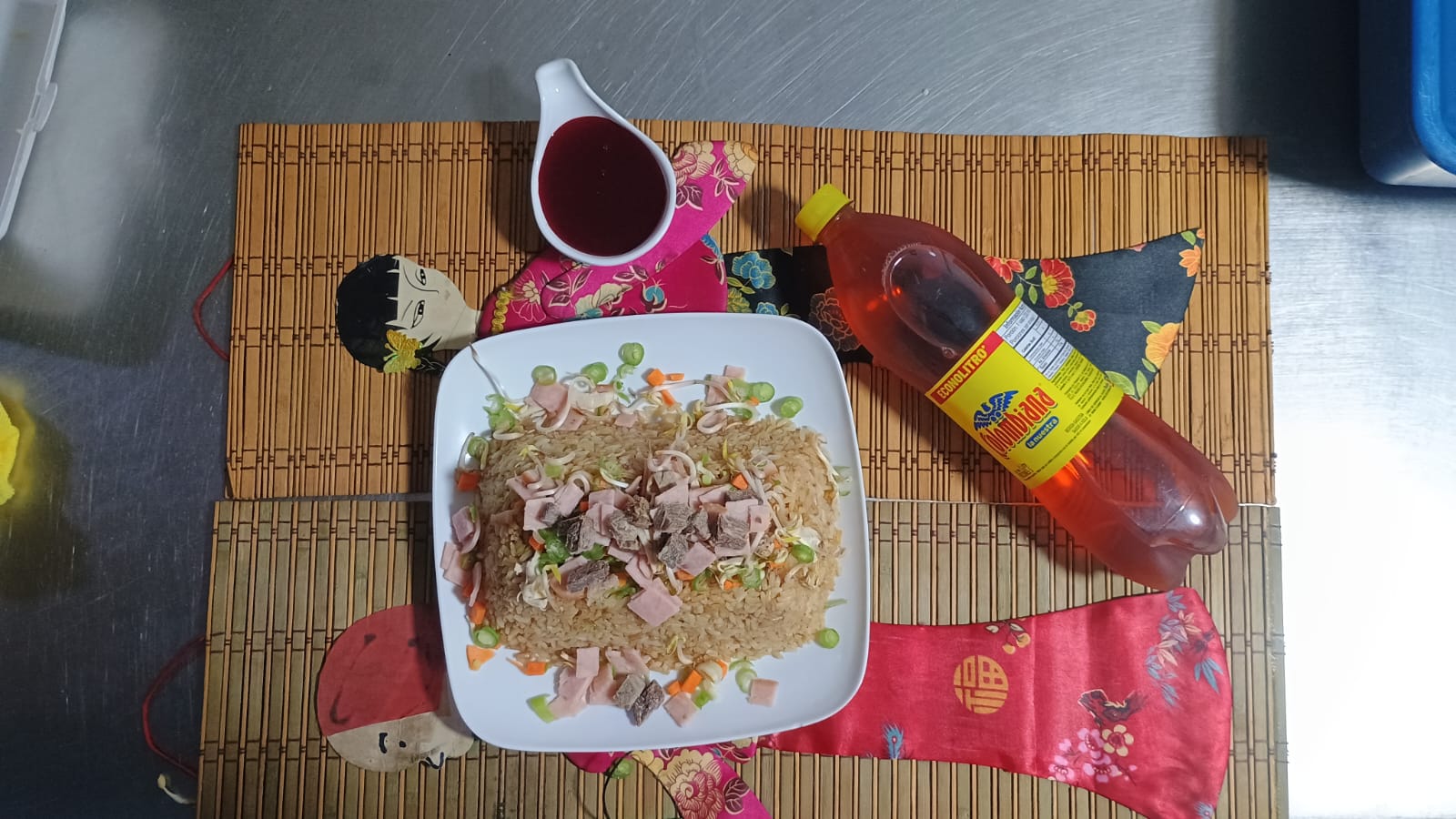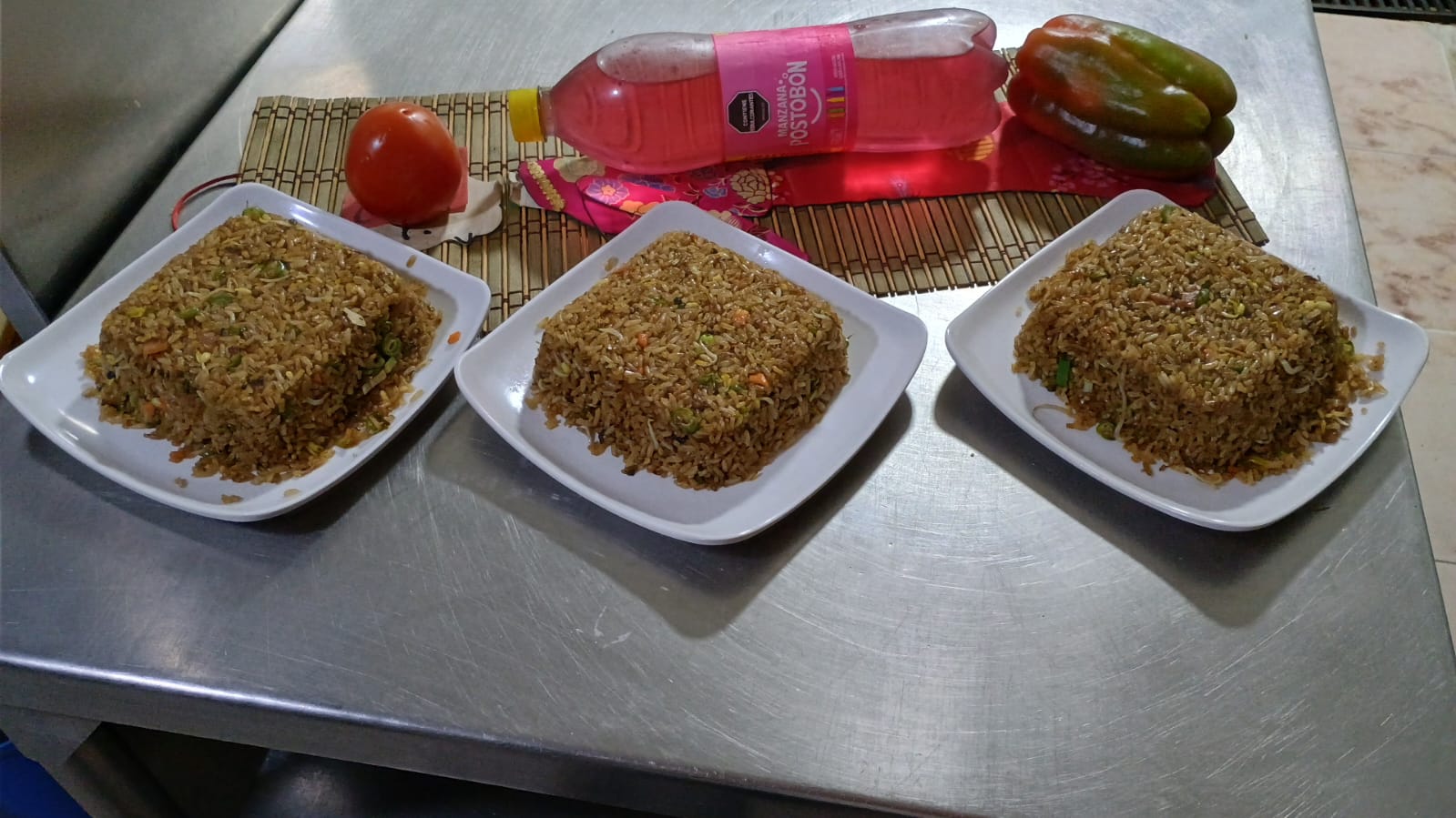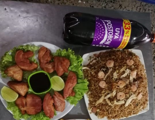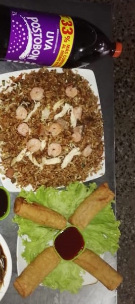 3 porciones personales de arroz chino con carne picada, jamón picado y pechuga desmechada + 1 litro de gaseosa sabor a disponibilidad