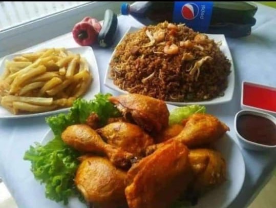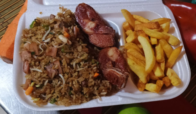 Arroz con jamón y pollo acompañado de 2 costilla de cerdo o dos alitas y 80 grms de papa a la francesa o criolla