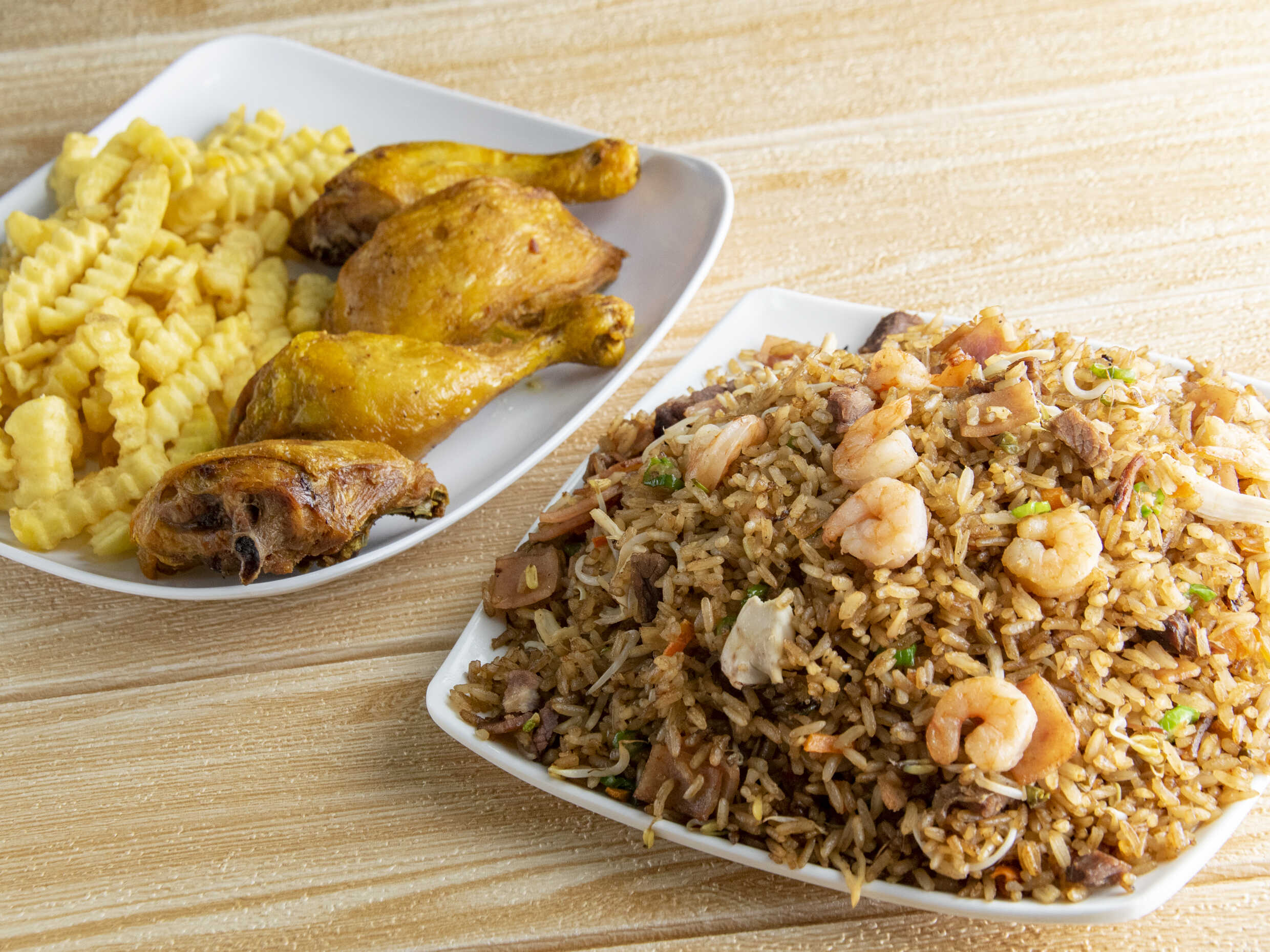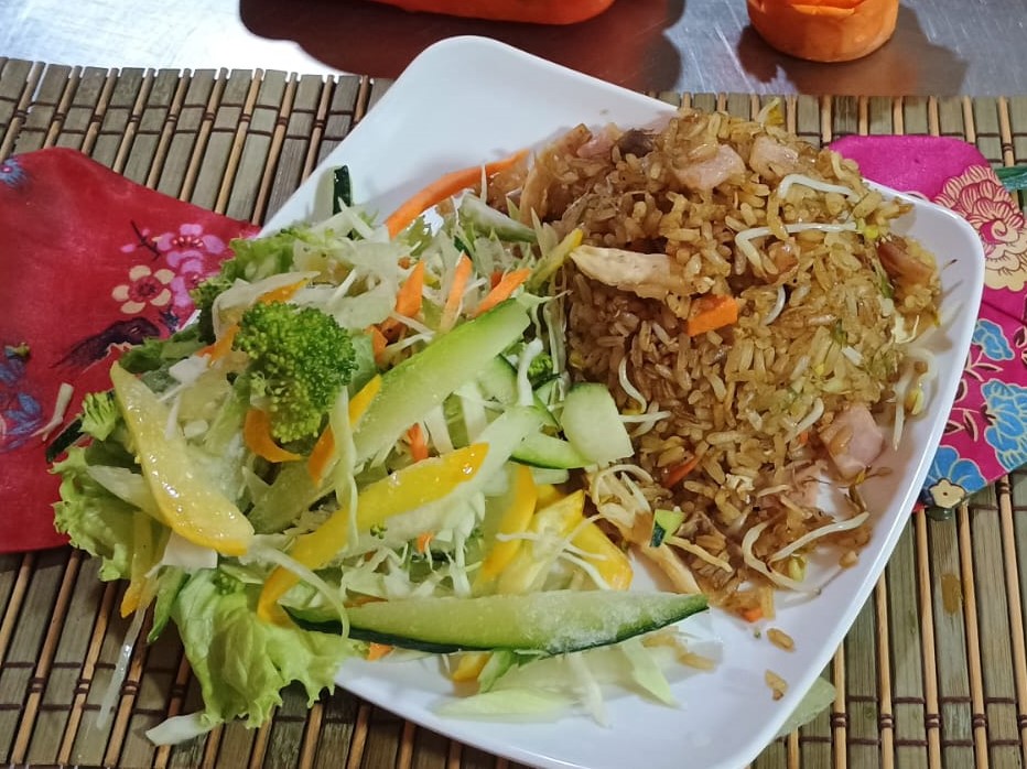 Arroz chino especial preparado con cebollín raíces chinas y jamón ahumado acompañado de papas francesas o 1 lumpia según tu preferencia. (Para máx. 2 personas)