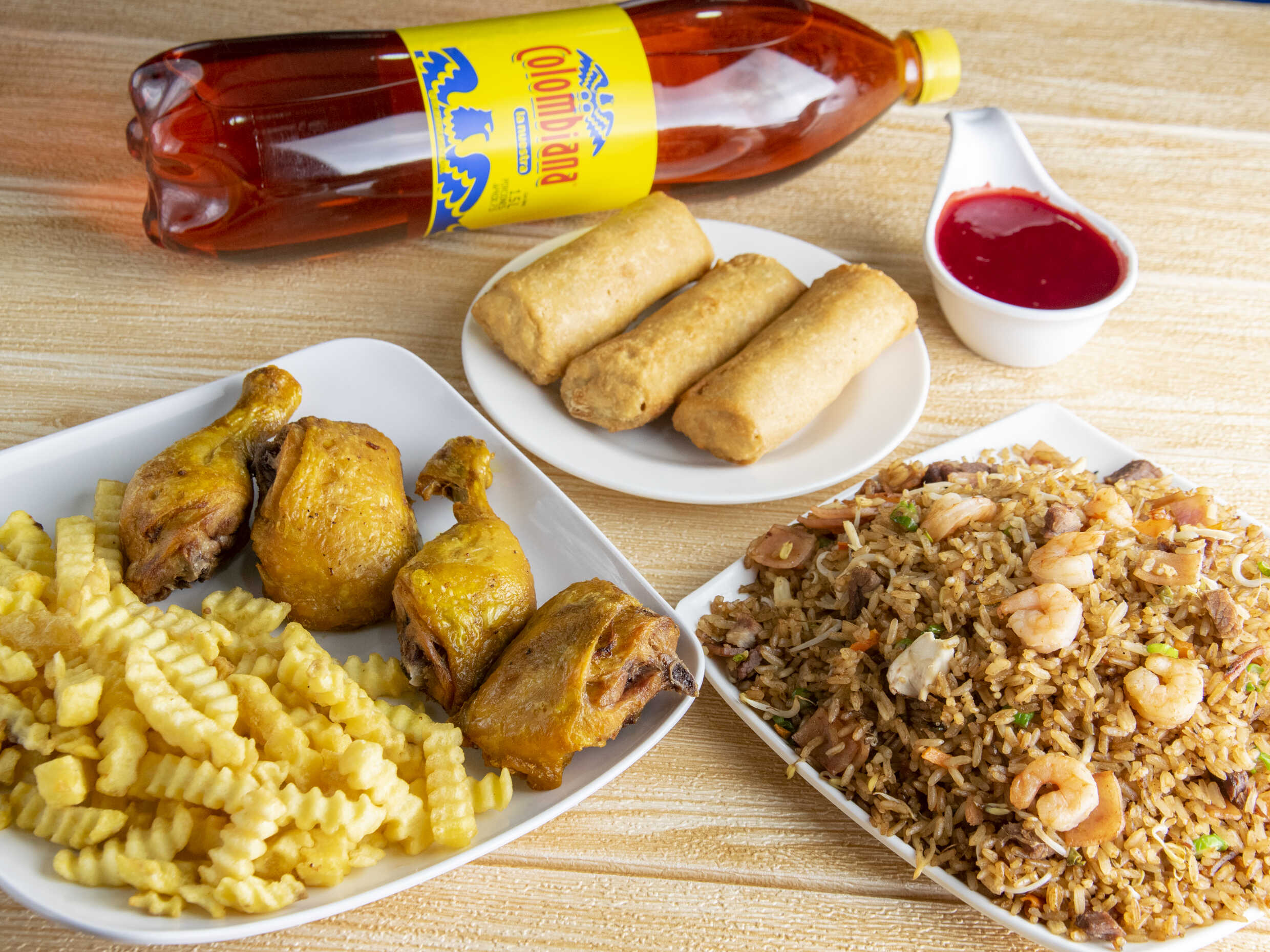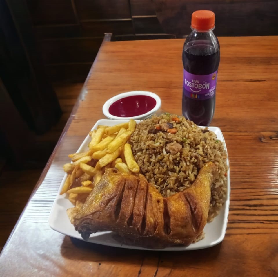Arroz mixto tres carnes , res jamón y pechuga acompañado de 1 litro de gaseosa y salsas de la casa.