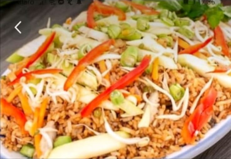 Arroz mixto con dos carnes (jamón y pollo desmechado),raiz china y verduras al wok acompañado de n 1 lt de gaseosa y salsas