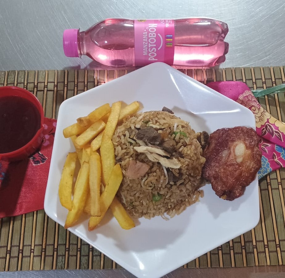 200 gr de delicioso arroz, 1 costilla de cerdo, 70gr de papas a la francesa y una gaseosa 250ml