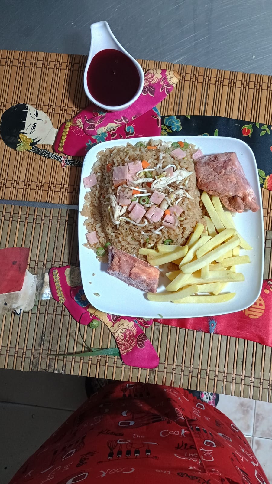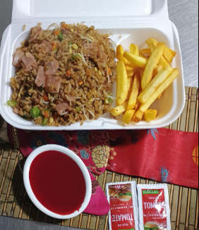 Arroz chino preparado con cebollín, raíces chinas, jamon ahumado, acompañado de una porción papa a la francesa y salsas de tomate y agridulce. (Porción personal)