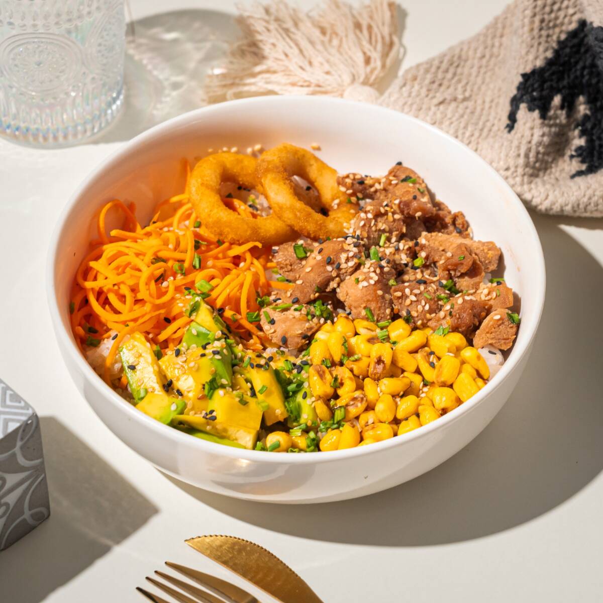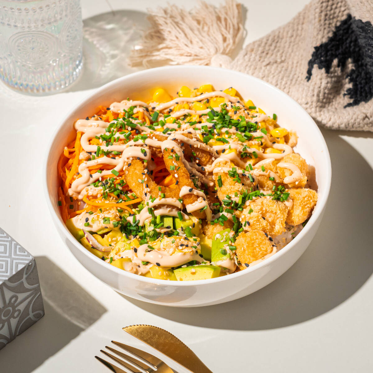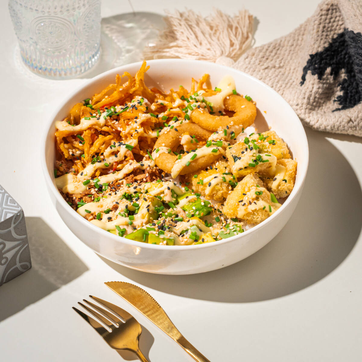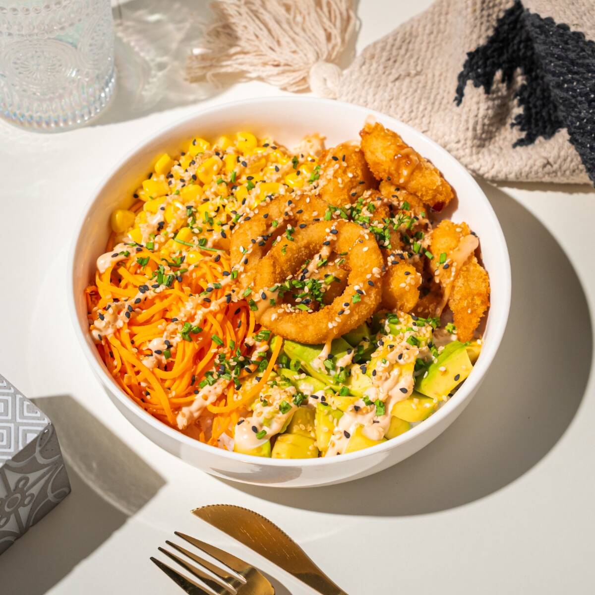 Poke bowl con arroz de sushi, camarones tempura, maíz tierno, aros de cebolla, aguacate, zanahoria, cebollín y salsa de la casa.