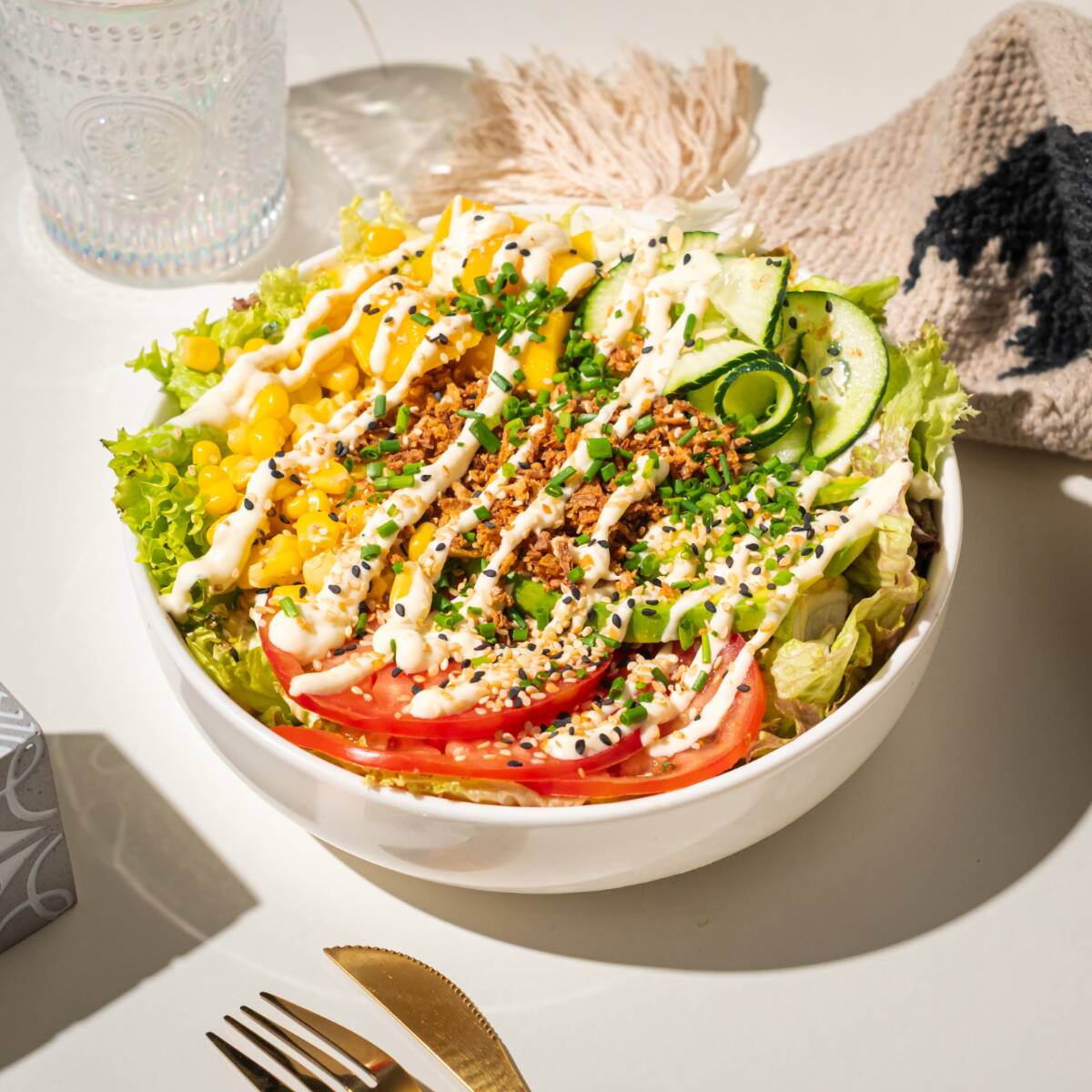 Bowl de ensalada con base de mix de lechugas, tomate, aguacate, zanahoria, maíz dulce, pepino, mango, cebolla crispy, salsa de la casa, cebollín, ajonjolí.