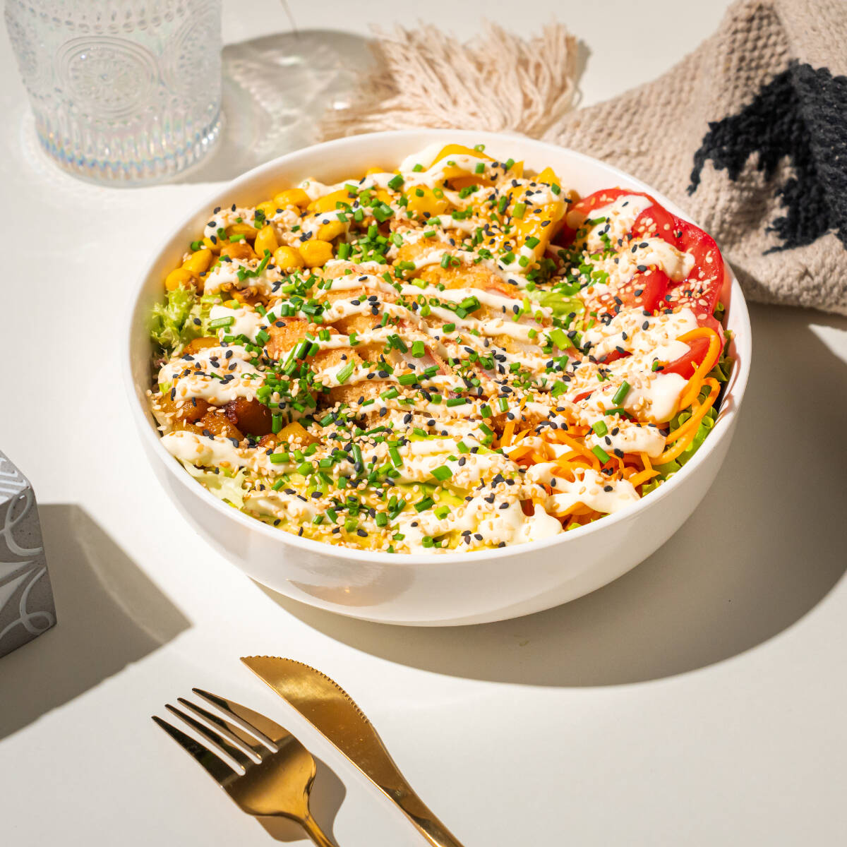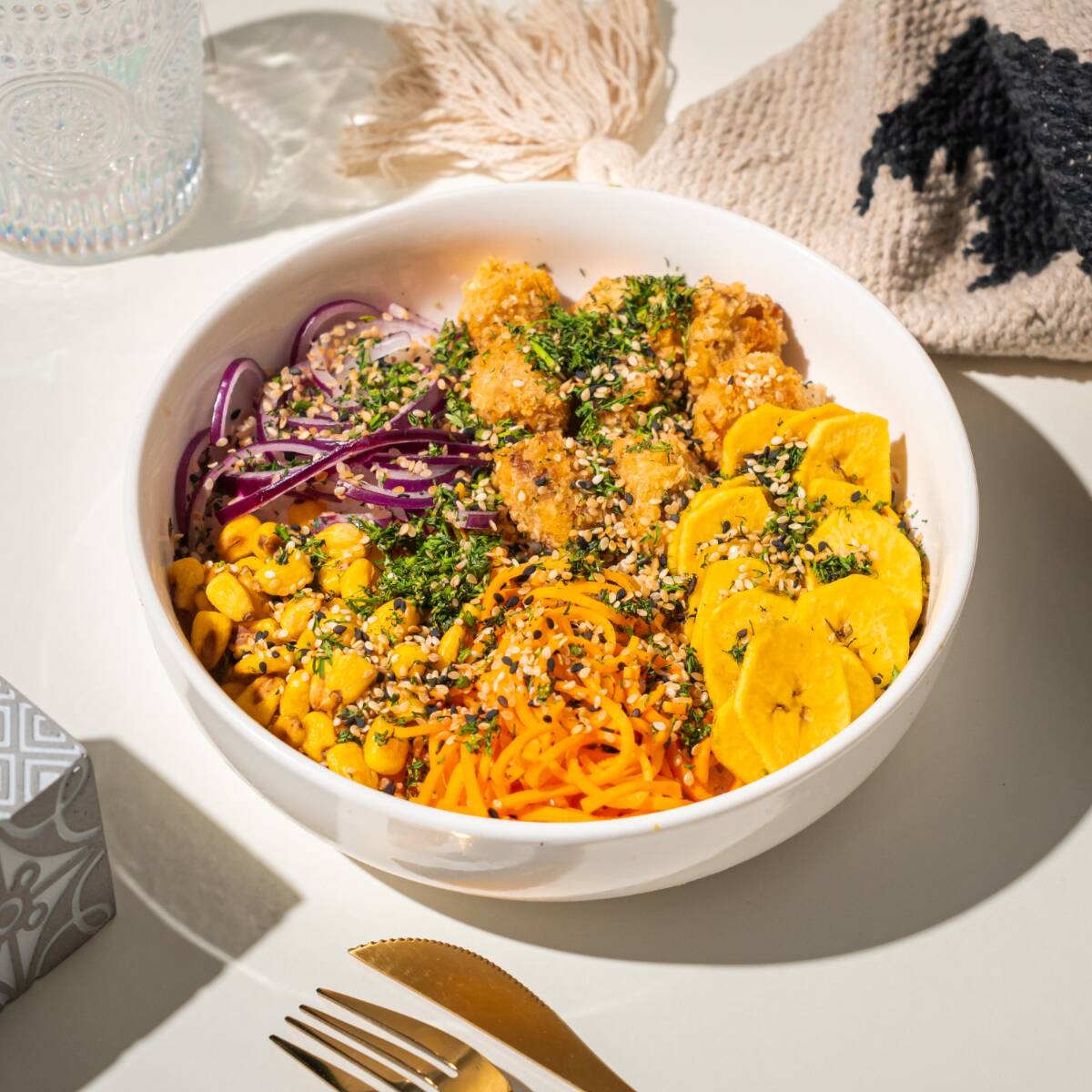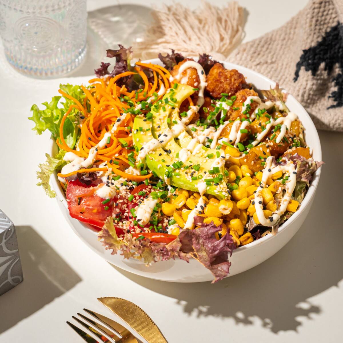 Bowl de ensalada con base de mix de lechugas, tomate, zanahoria, aguacate, pollo tempura bañado en salsa agridulce, plátano maduro, maíz tostado, cebollín, ajonjolí.