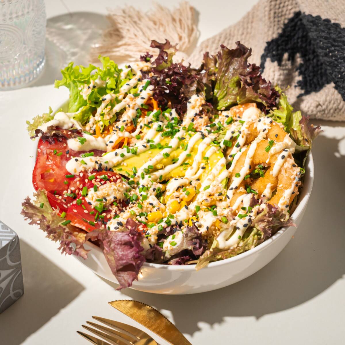 Bowl de ensalada con base de mix de lechugas y tomate, palmito de cangrejo tempura, maíz tostado, aguacate, plátano maduro, mango, zanahoria, salsa, ajonjolí y cebollín.