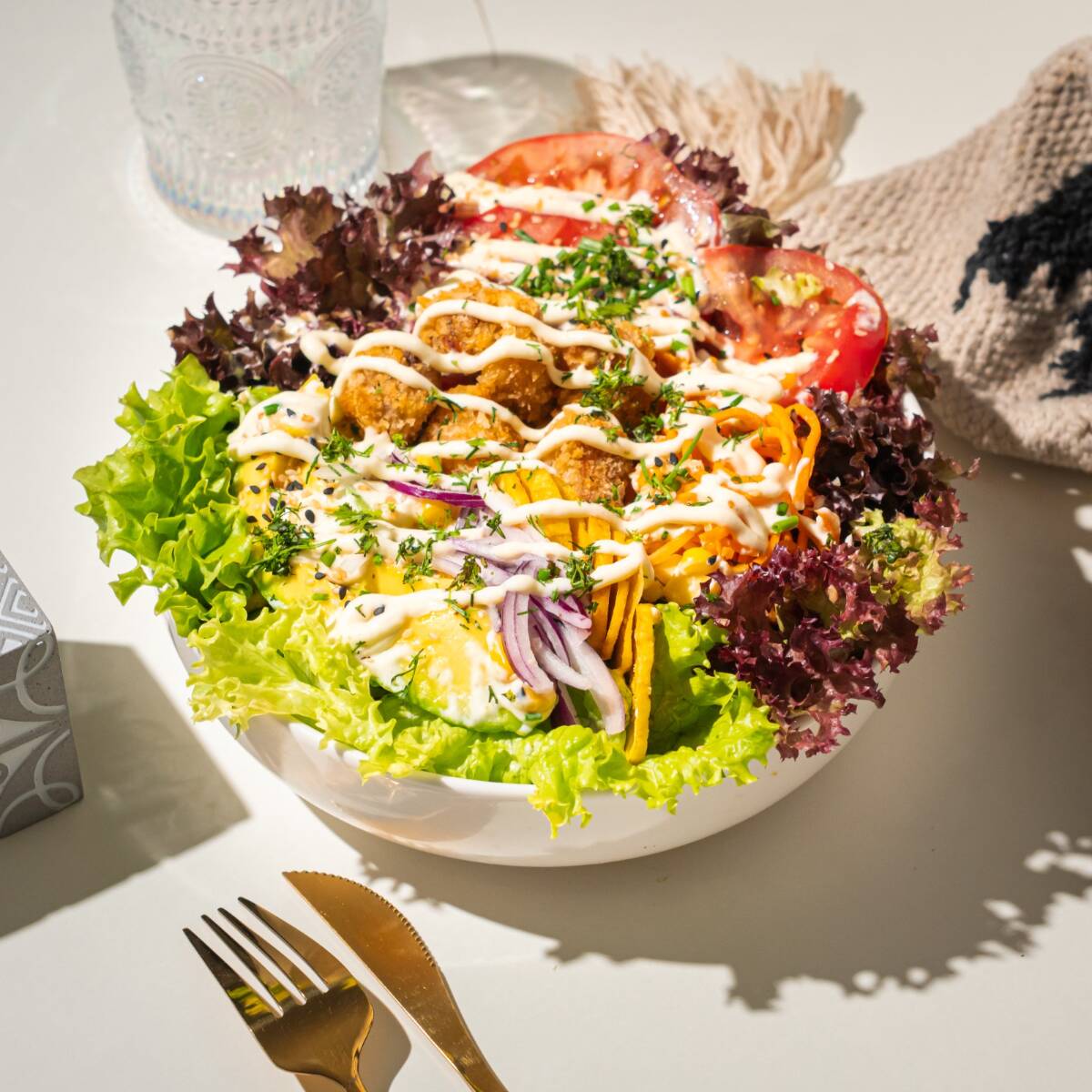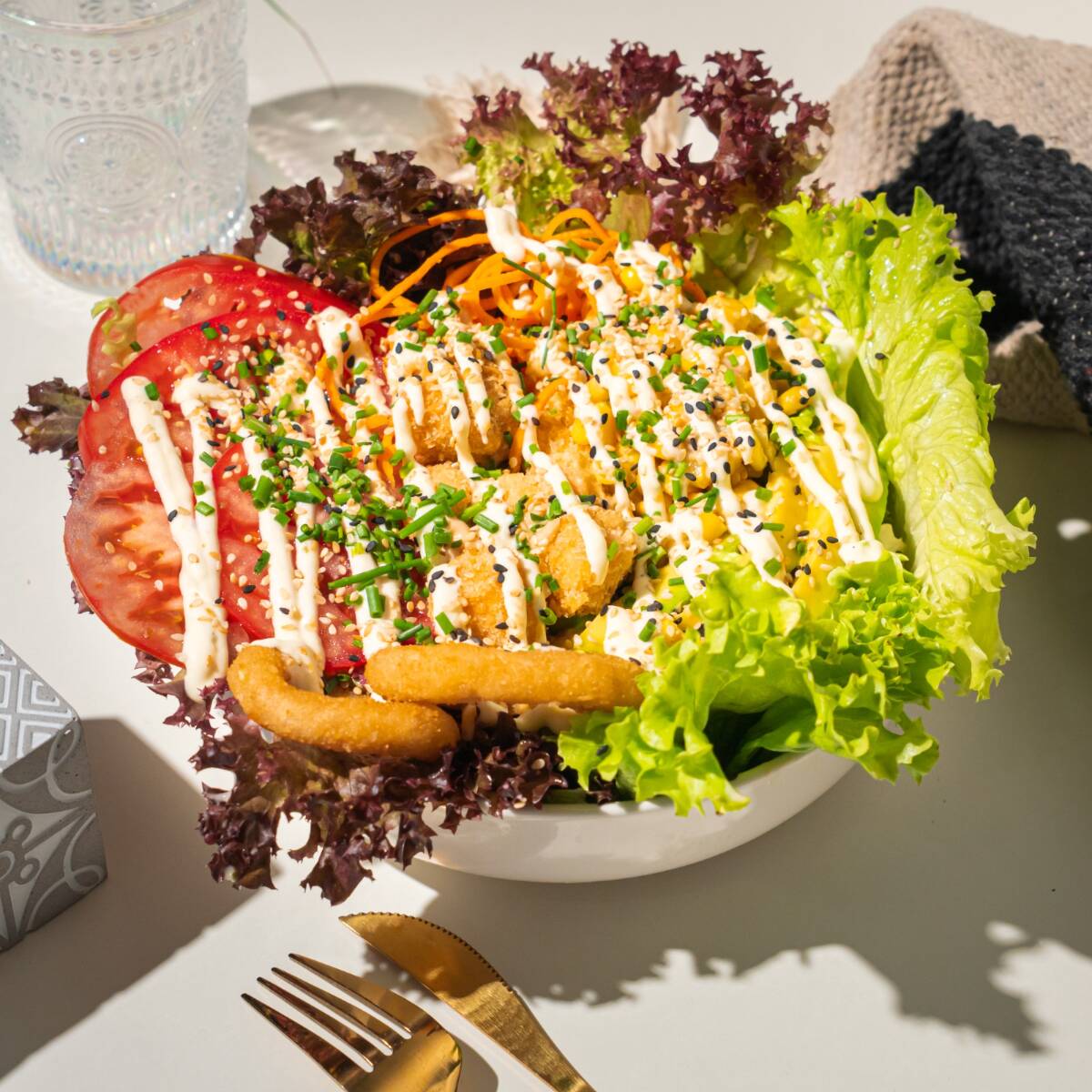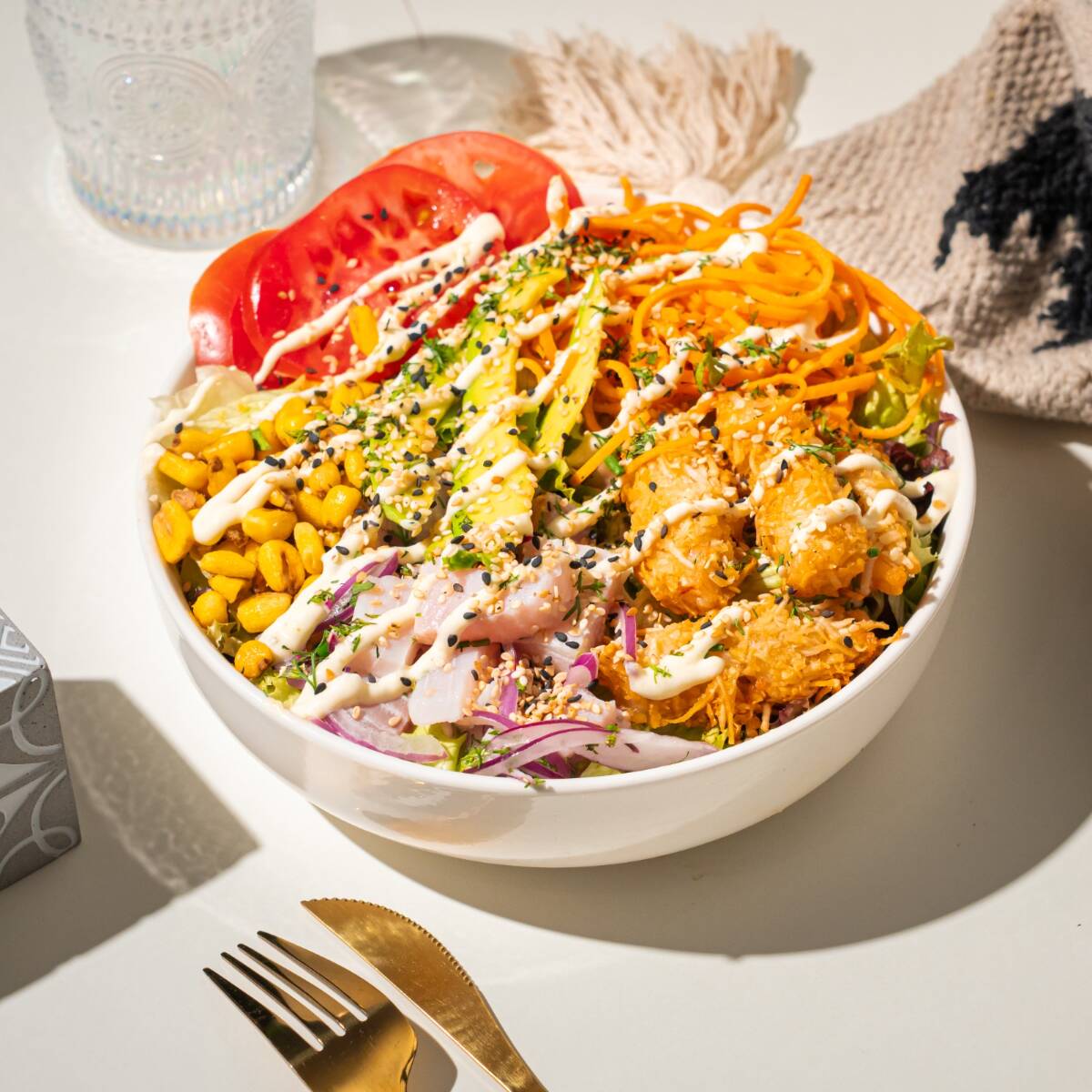 Bowl de ensalada con base de mix de lechugas y tomate, tilapia tempura, cebolla morada, mayonesa de plátano verde, maíz tostado, salsa acevichada, zanahoria, cebollín.