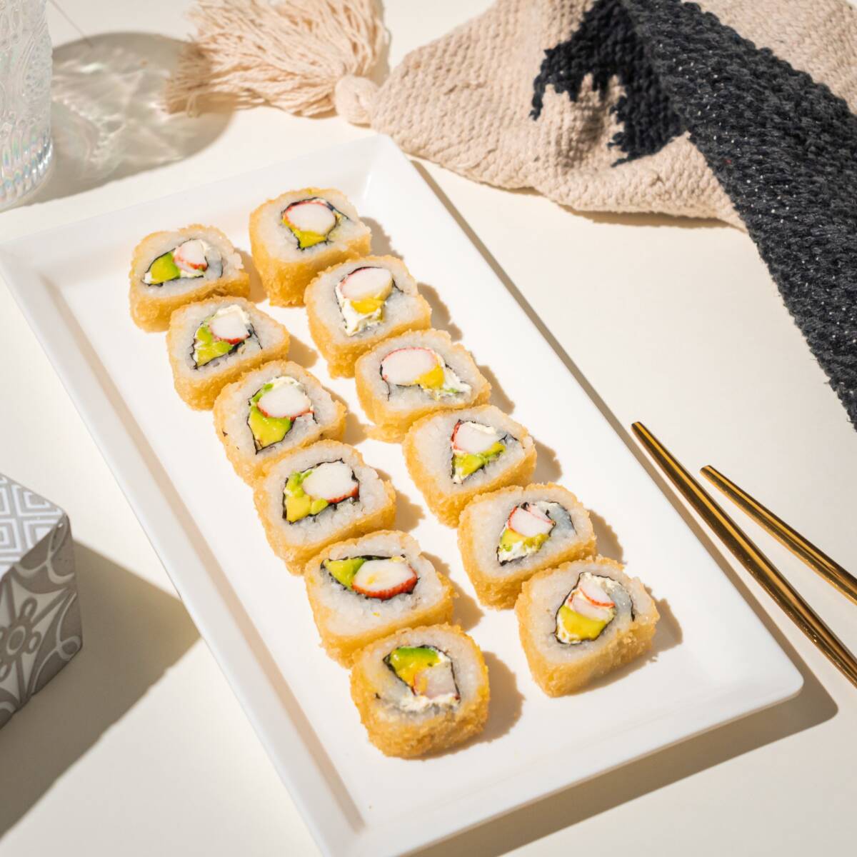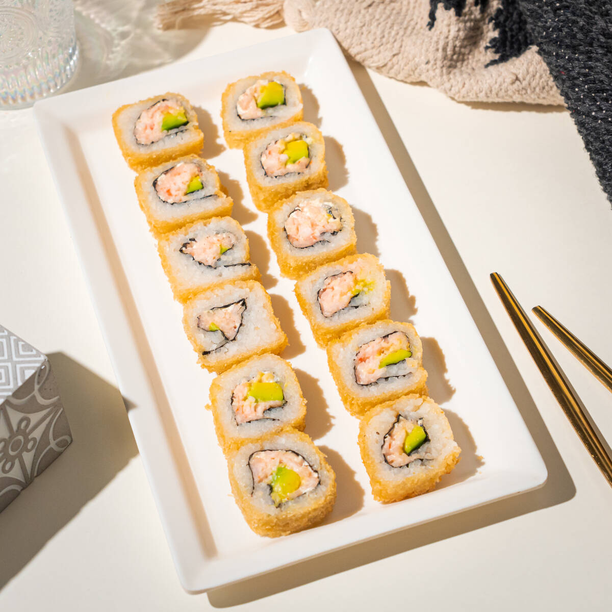 Sushi relleno de palmito de cangrejo, queso crema y aguacate, todo tempura, 12 pzas.
