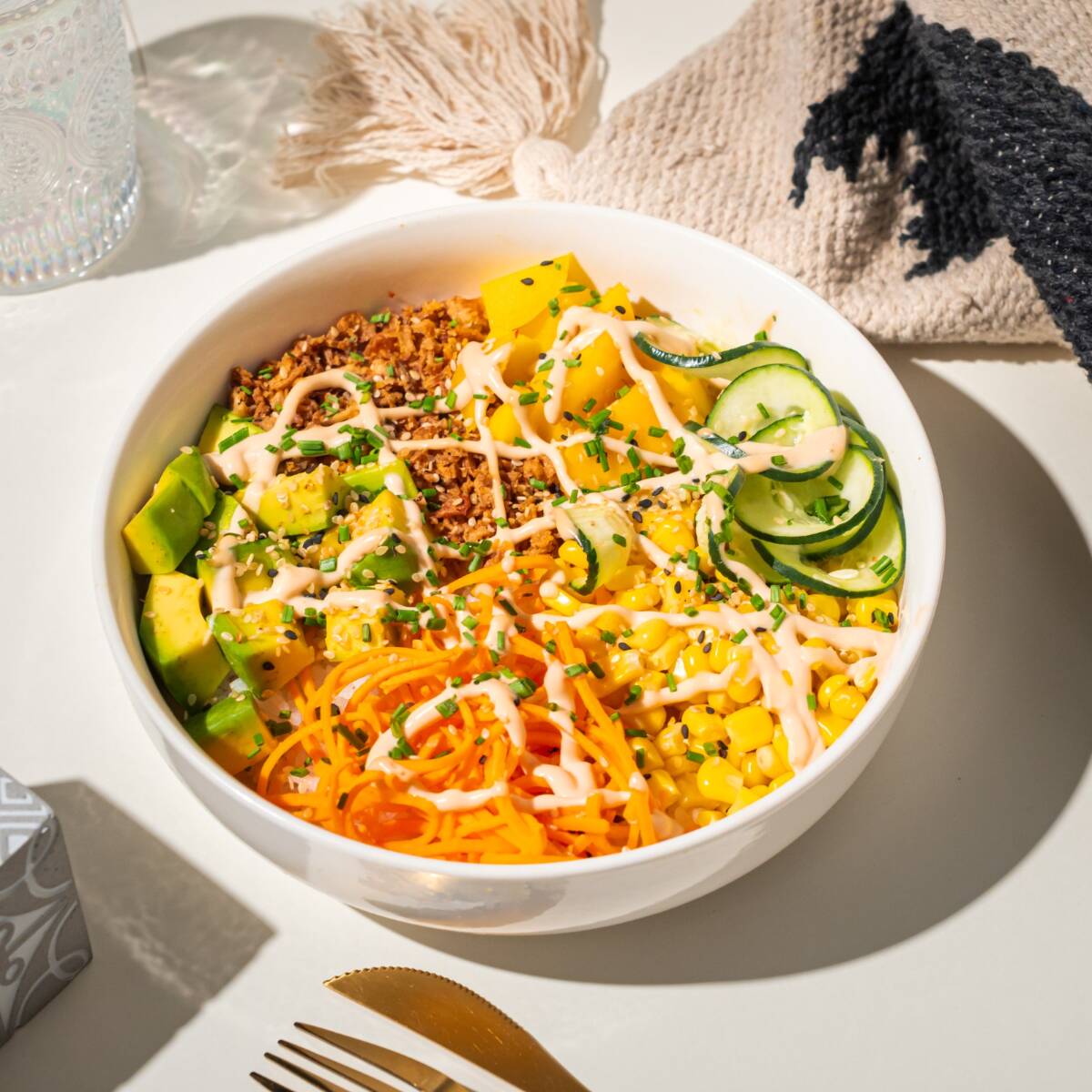Poke bowl con arroz de sushi, aguacate, zanahoria, maíz dulce, pepino, mango, cebolla crispy, salsa, cebollín y ajonjolí.