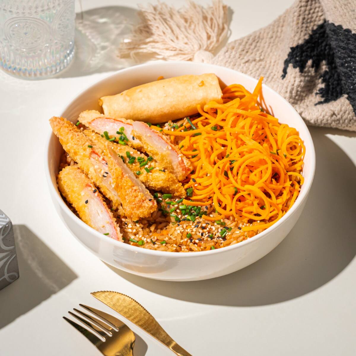 Arroz estilo chino salteado al wok con zanahoria, raíces chinas y soya, camarones crunch bañados en agridulce, zanahoria en espiral, un egg roll, ajonjolí mixto y cebollín.