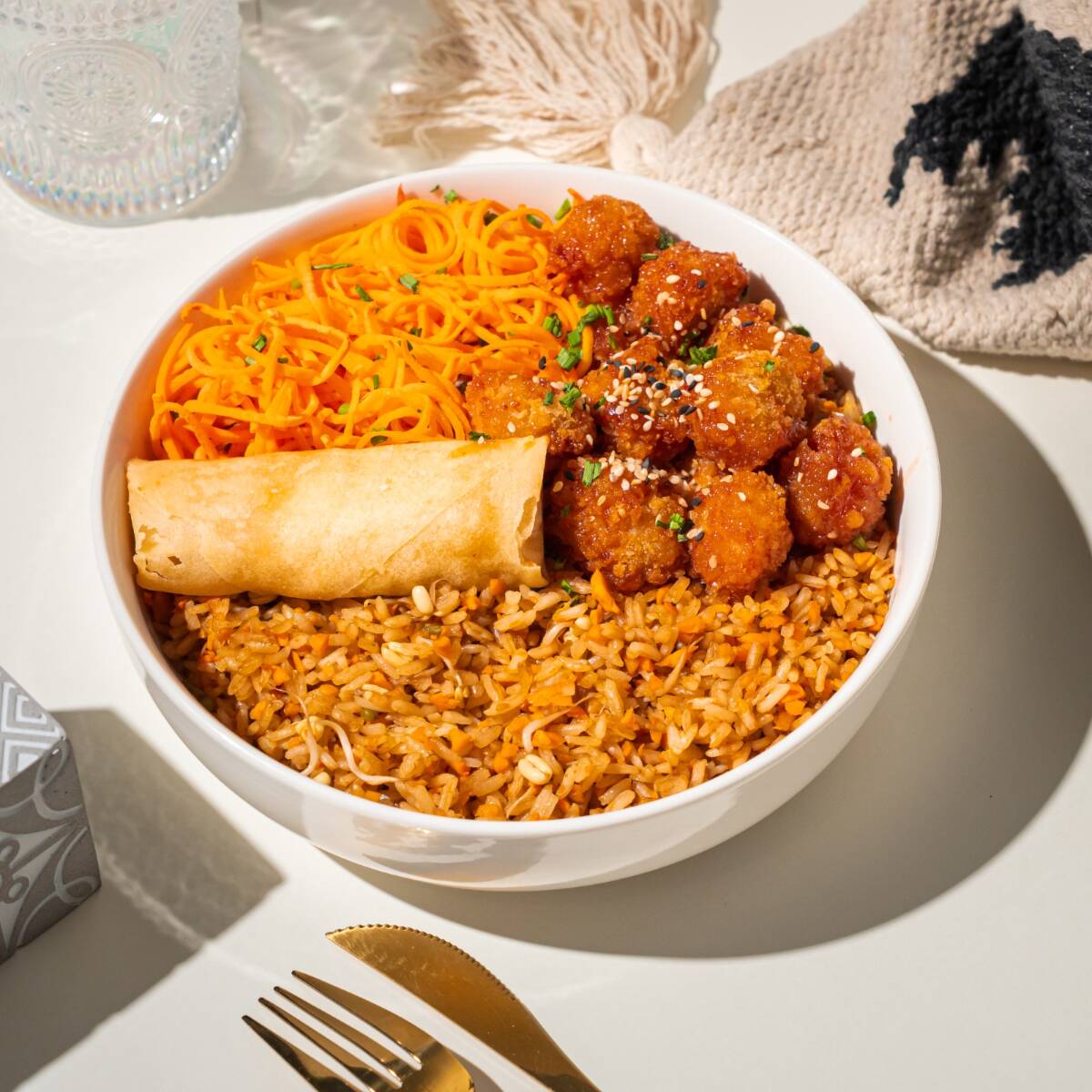 Arroz estilo chino salteado al wok con zanahoria, raíces chinas y soya, pollo crunch bañado en agridulce, zanahoria en espiral, un egg roll, ajonjolí mixto y cebollín.
