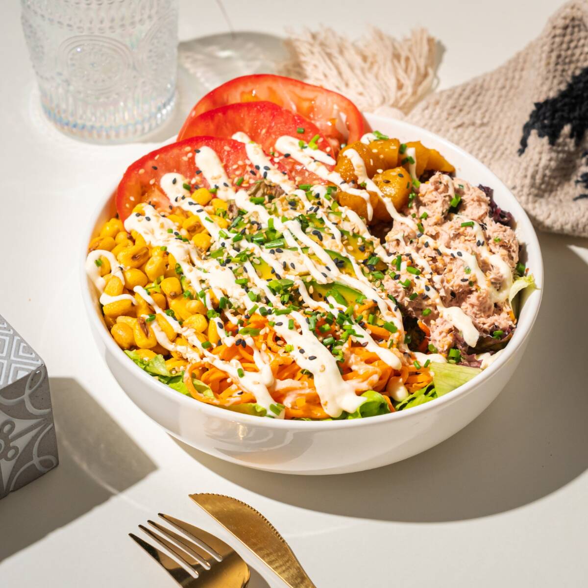 Bowl de ensalada con base de mix de lechugas y tomate, atún enlatado con mayonesa japonesa y cebollín, plátano maduro, aguacate, zanahoria, ajonjolí, salsa.