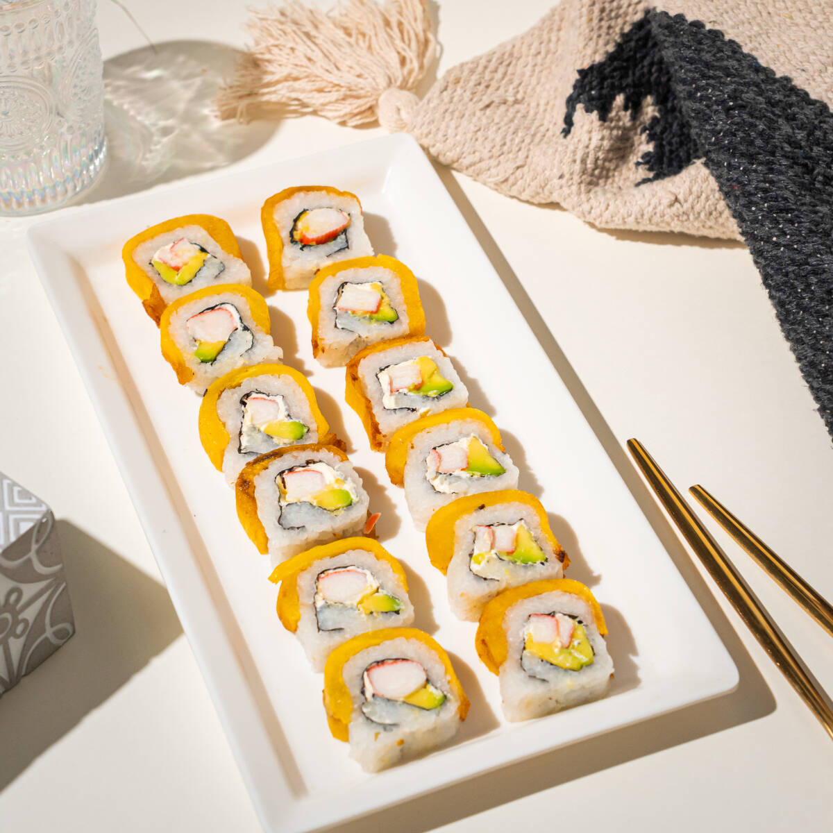 Sushi relleno de palmito de cangrejo, aguacate y queso crema y cubierto de plátano maduro, 12 pzas.